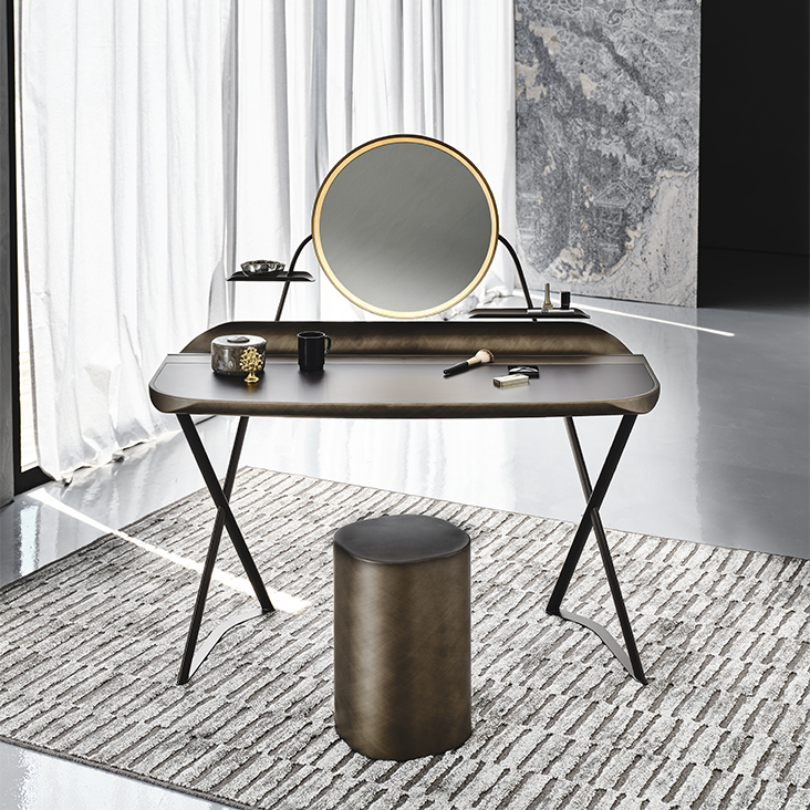 Dressing desk with base in titanium (GFM11), bronze (GFM18) or black (GFM73) embossed lacquered steel. Top in leather as per sample card with Brushed Bronze or Brushed Grey lacquered and rounded lower profile and grooved tray in Brushed Bronze or Brushed Grey lacquered steel. Mirror with frame in titanium (GFM11), bronze (GFM18), black (GFM73), Brushed bronze or Brushed Grey embossed lacquered steel with lateral supports and shelves in titanium (GFM11), bronze (GFM18) or black (GFM73) embossed lacquered steel. LED light.