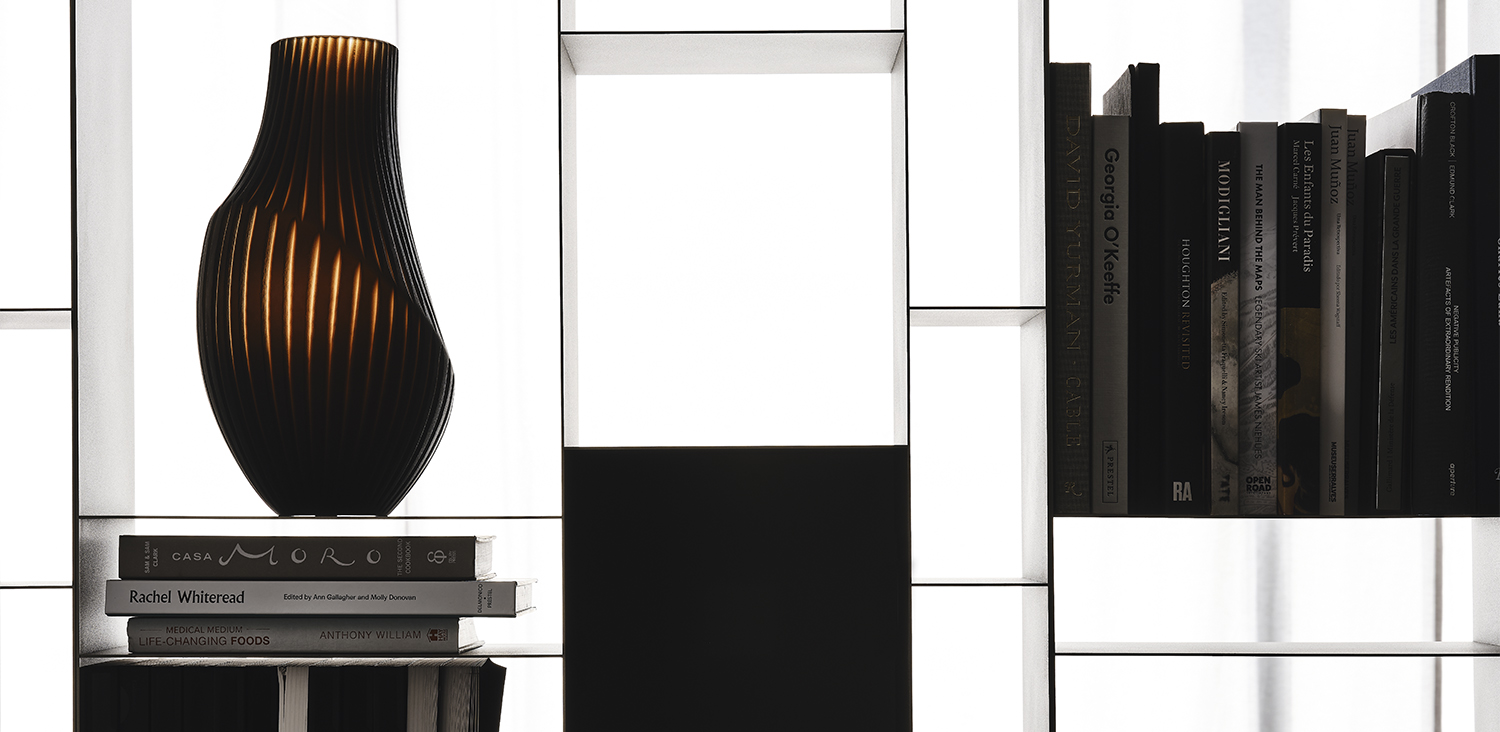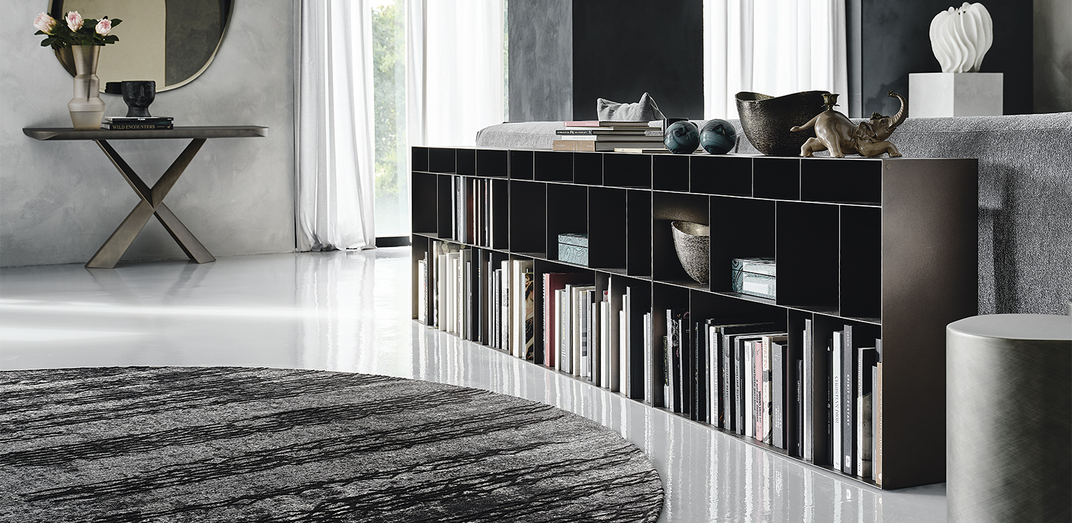 Bookcase in titanium (GFM11) or bronze (GFM18) embossed lacquered steel, each unit can be set up side by side or stackable. Wall anchorage is necessary if the optional ballast is not fixed.