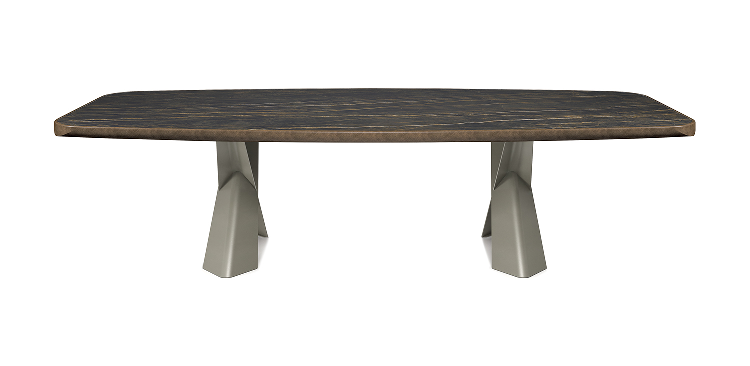 Table with base in titanium (GFM11), bronze (GFM18), graphite (GFM69) or black (GFM73) embossed lacquered steel, Brushed Bronze or Brushed Grey. Top in ceramic Marmi Alabastro (KM02), Supreme (KM03), Ardesia (KM04), matt Golden Calacatta (KM05), glossy Golden Calacatta (KM06), matt Portoro (KM07), glossy Portoro (KM08), glossy Sahara Noir (KM09), Emperador (KM10), Makalu (KM11), Breccia (KM12) or Arenal (KM13) with Brushed Bronze or Brushed Grey lacquered and rounded lower profile. 6cm thick top on 300x128 version and 5cm on 240x120 version.