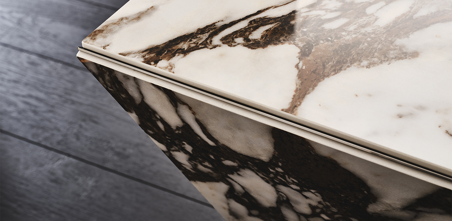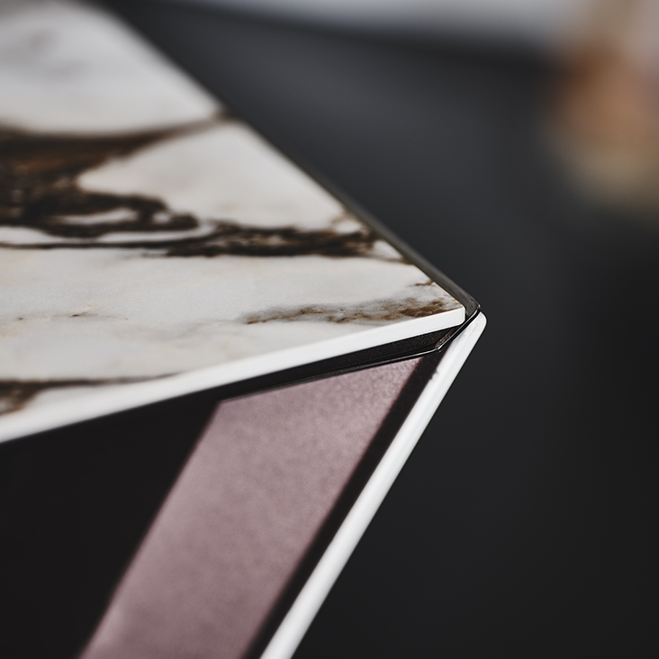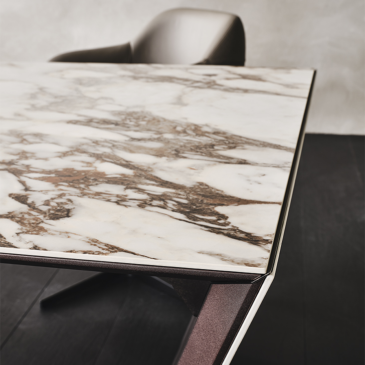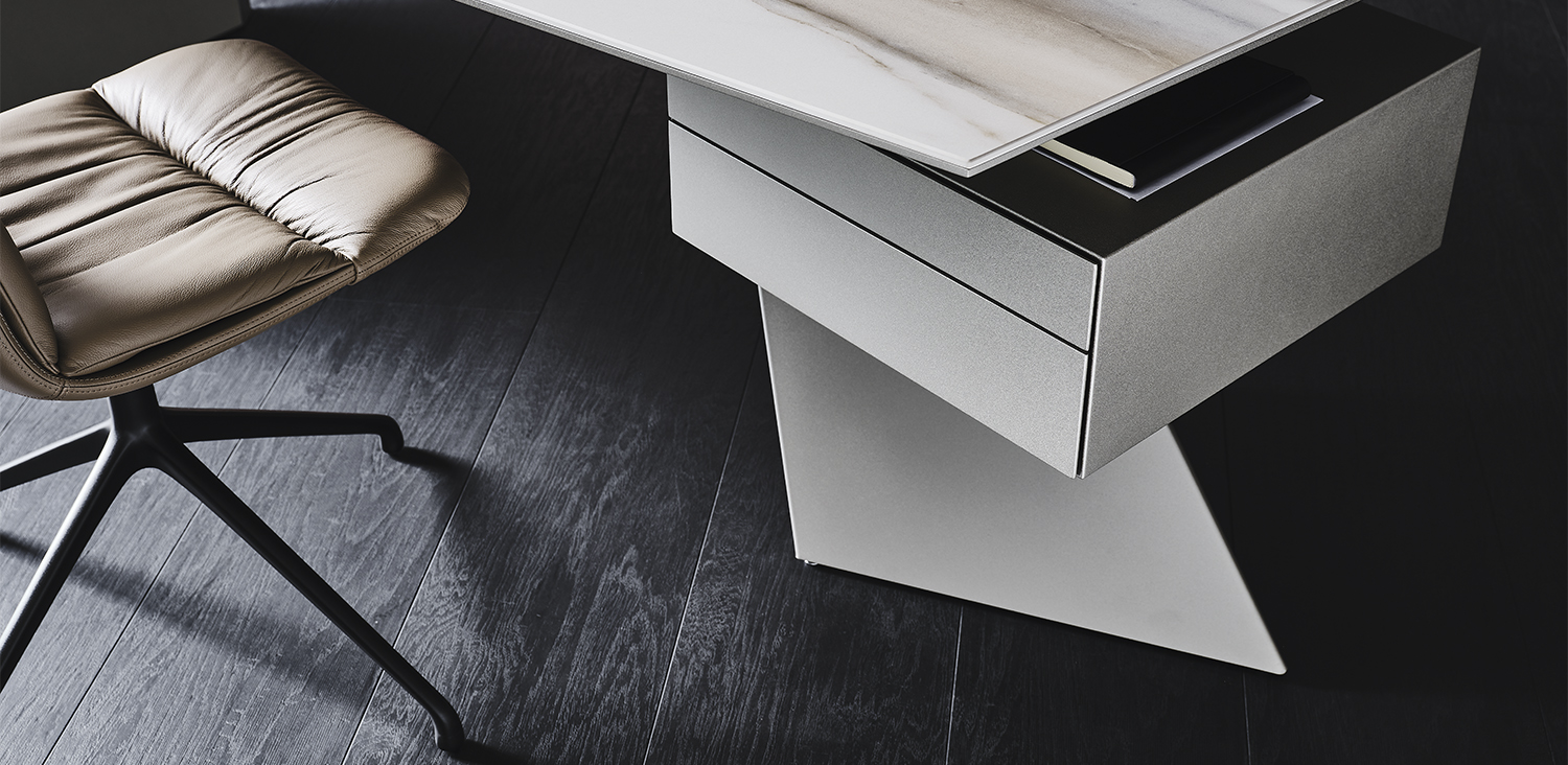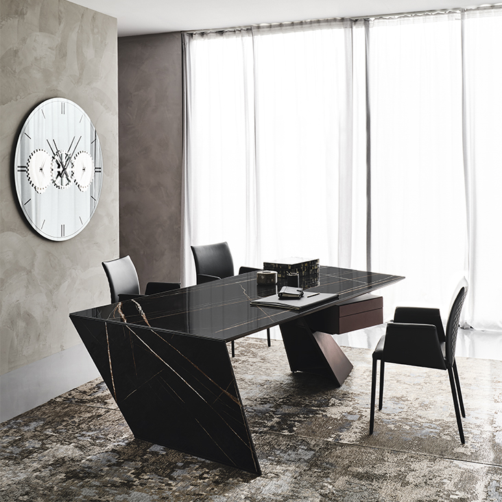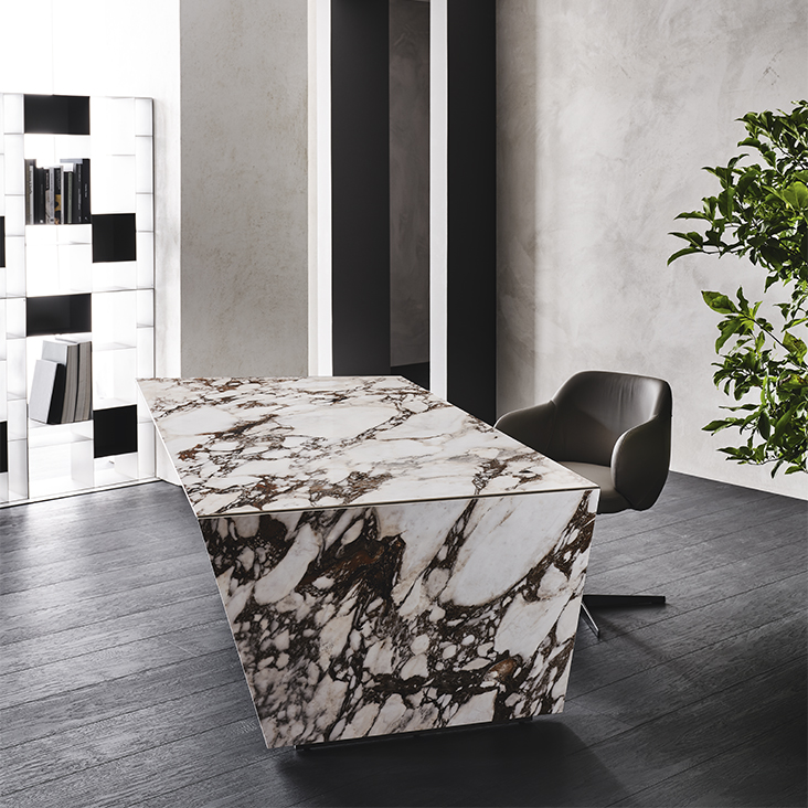 Desk in Marmi ceramic Alabastro (KM02), Supreme (KM03), Ardesia (KM04), matt Golden Calacatta (KM05), glossy Golden Calacatta (KM06), matt Portoro (KM07), glossy Portoro (KM08), glossy Sahara Noir (KM09), Emperador (KM10), Makalu (KM11), Breccia (KM12) or Arenal (KM13) with insert in black chrome (06). Leg in graphite (GFM69), titanium (GFM11) or bronze (GFM18) embossed lacquered steel, structure and drawer unit embossed lacquered wood matching the color of the leg.