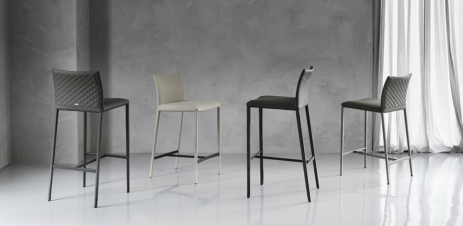 Stool with steel frame covered in synthetic leather, fabric, synthetic nubuck, micro nubuck or soft leather as per sample card. The cover is not removable.