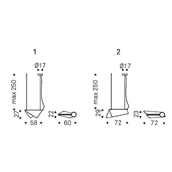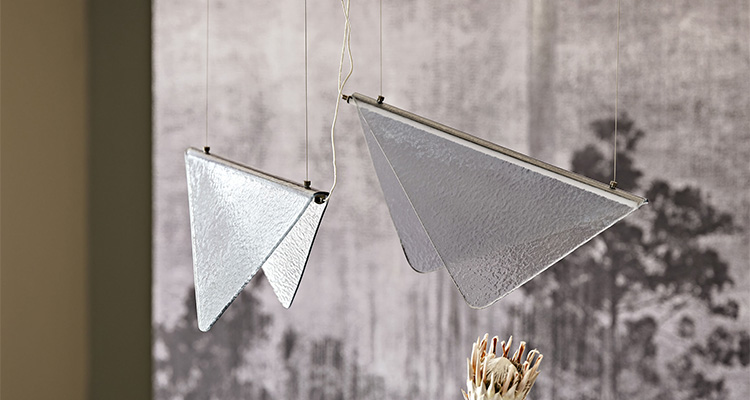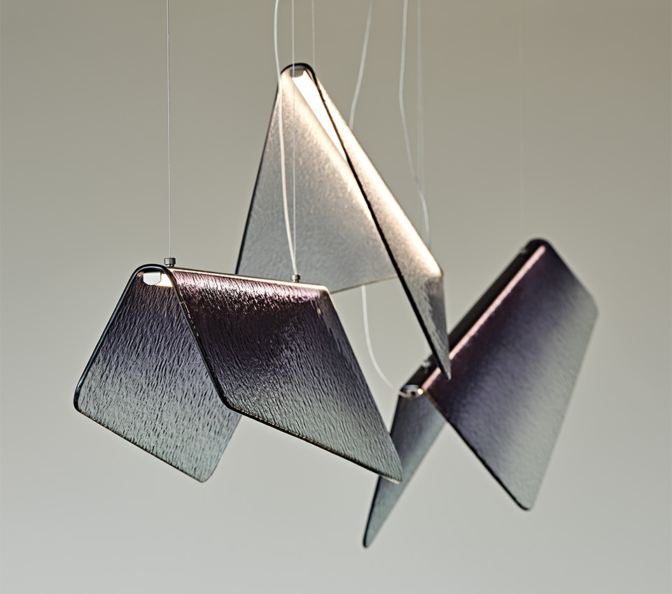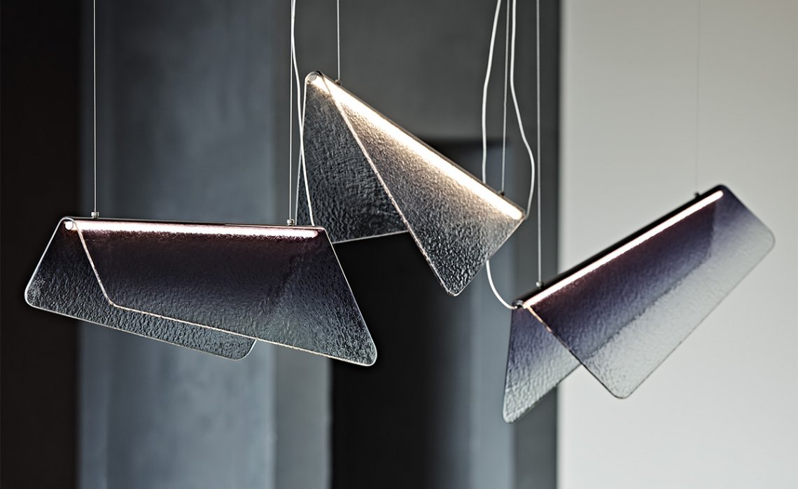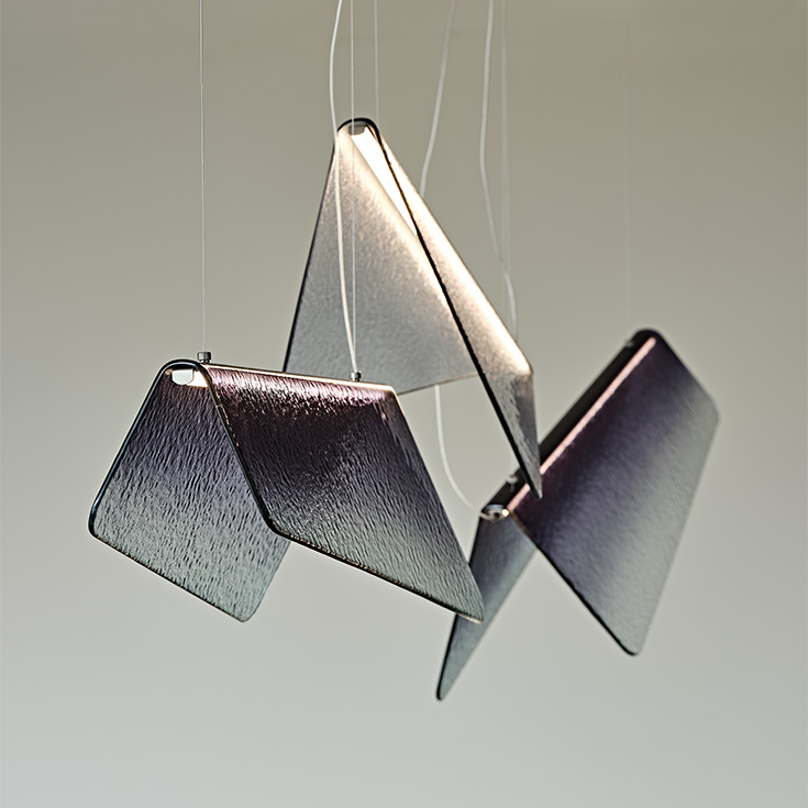Velar has a simple design embellished with carefully selected details, such as the rough surface of the glass and the more intense smoky colour towards the centre. An LED light is positioned along the central fold and radiates elegantly, highlighting the shade of the glass. This delicate design suspended lamp makes the greatest impact if two or more models with different heights or directions are placed side by side to create a graceful composition. Depending on the natural brightness of the room, Velar comes in different shades from grey to blue.