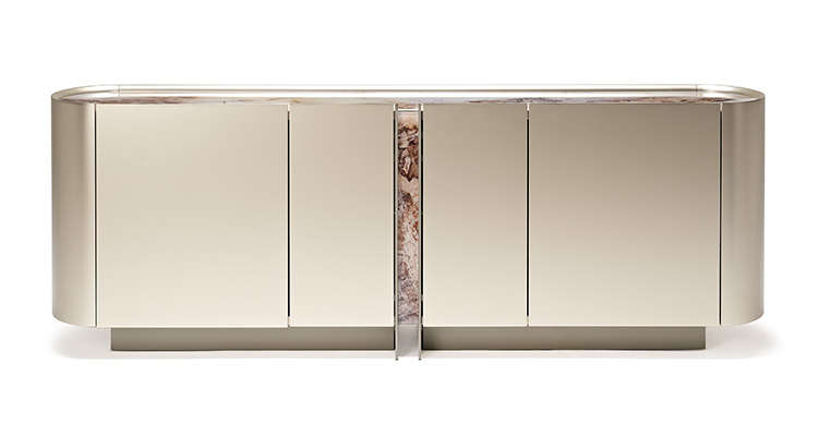 This design sideboard is rich in carefully selected details such as the rounded sides or the edge of the upper top, raised above the glass plate.