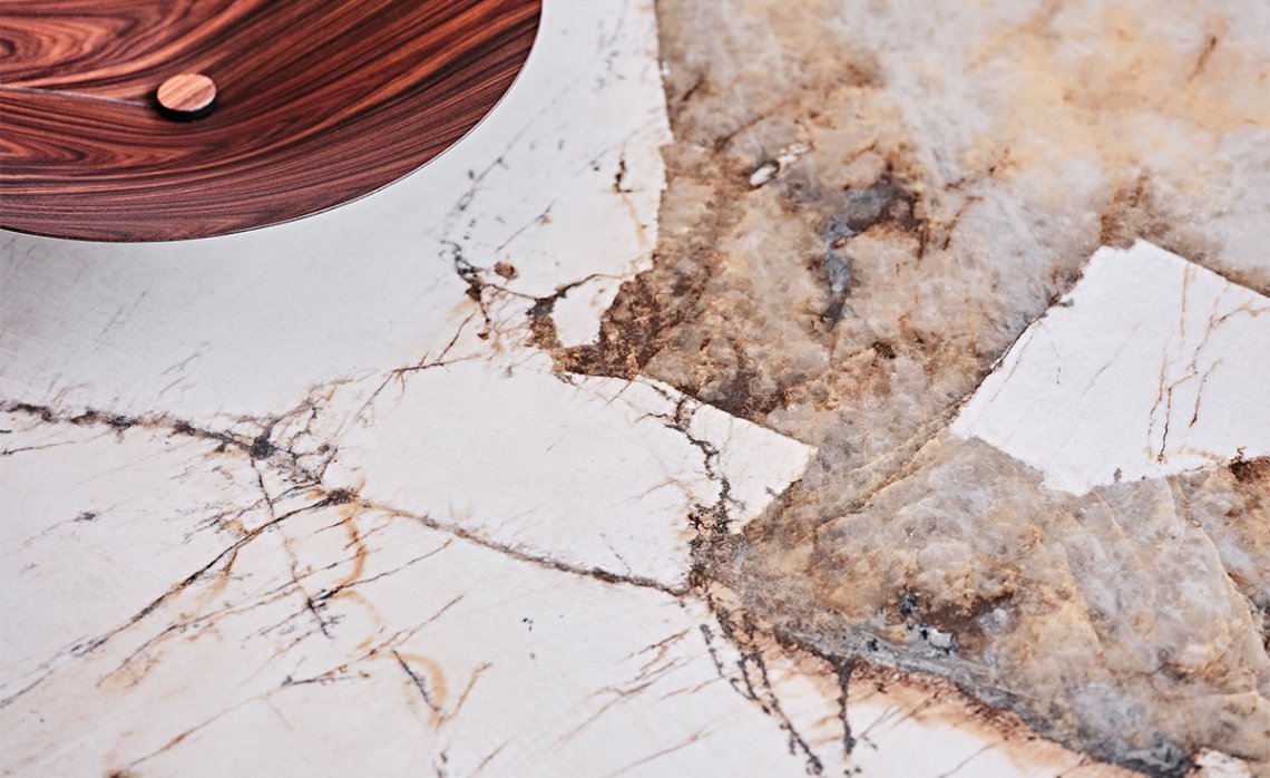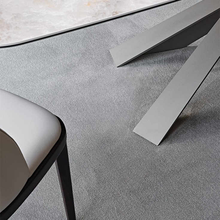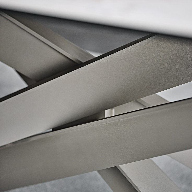 Four blades cut through the air and intersect each other, creating an energetic composition with an apparently irreproducible pattern. Each leg is designed with a T-section, which multiplies the opportunities for crossing and overlapping. The entire base is thus strengthened by a rhythmic chiaroscuro effect, in which the blind zones contrast with the metal portions struck by the light.The bold aesthetic, unafraid of attracting attention, extends to several variants. The standard model is made of transparent glass, allowing you to appreciate the sculptural base in its entirety.