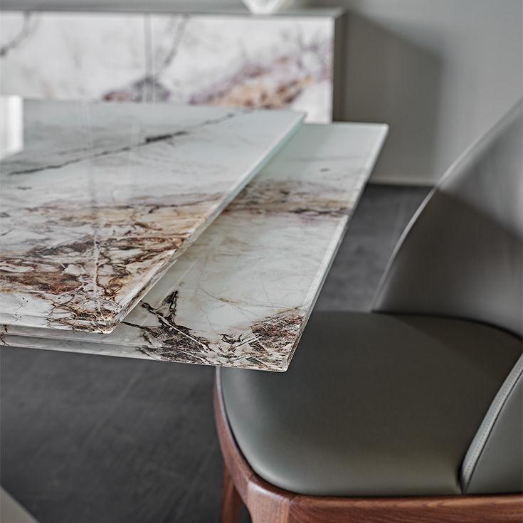 Customization is key to meet many design needs. You may choose between: Premier Crystalart and Premier Crystalart Drive glass tables, decorated with an artistic printing, the latter is an extendable glass table; Premier Keramik with a refined ceramic top, also available in the extendable table version Keramik Drive; Premier Wood and Premier Wood Drive, the first one with irregular edges, the second one with oblique regular edges. Premier design tables pay homage to the finest materials of Italian manufacturing and celebrate conviviality even in limited spaces.