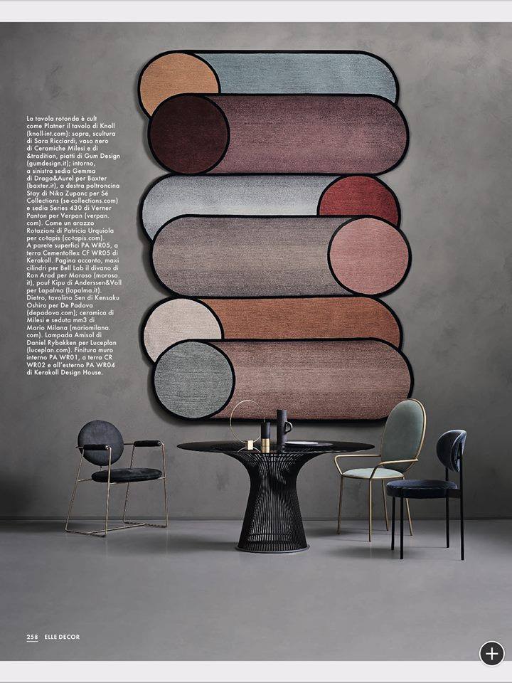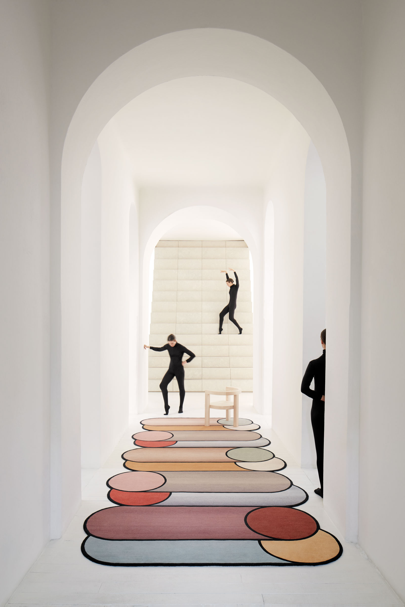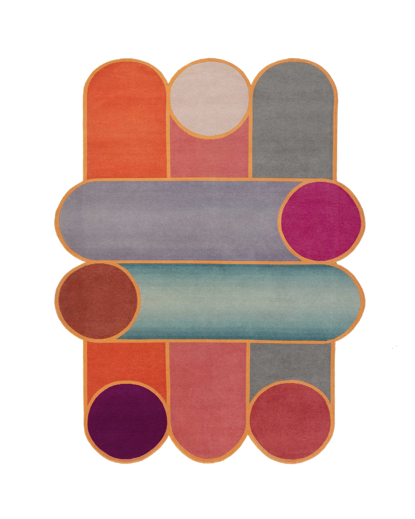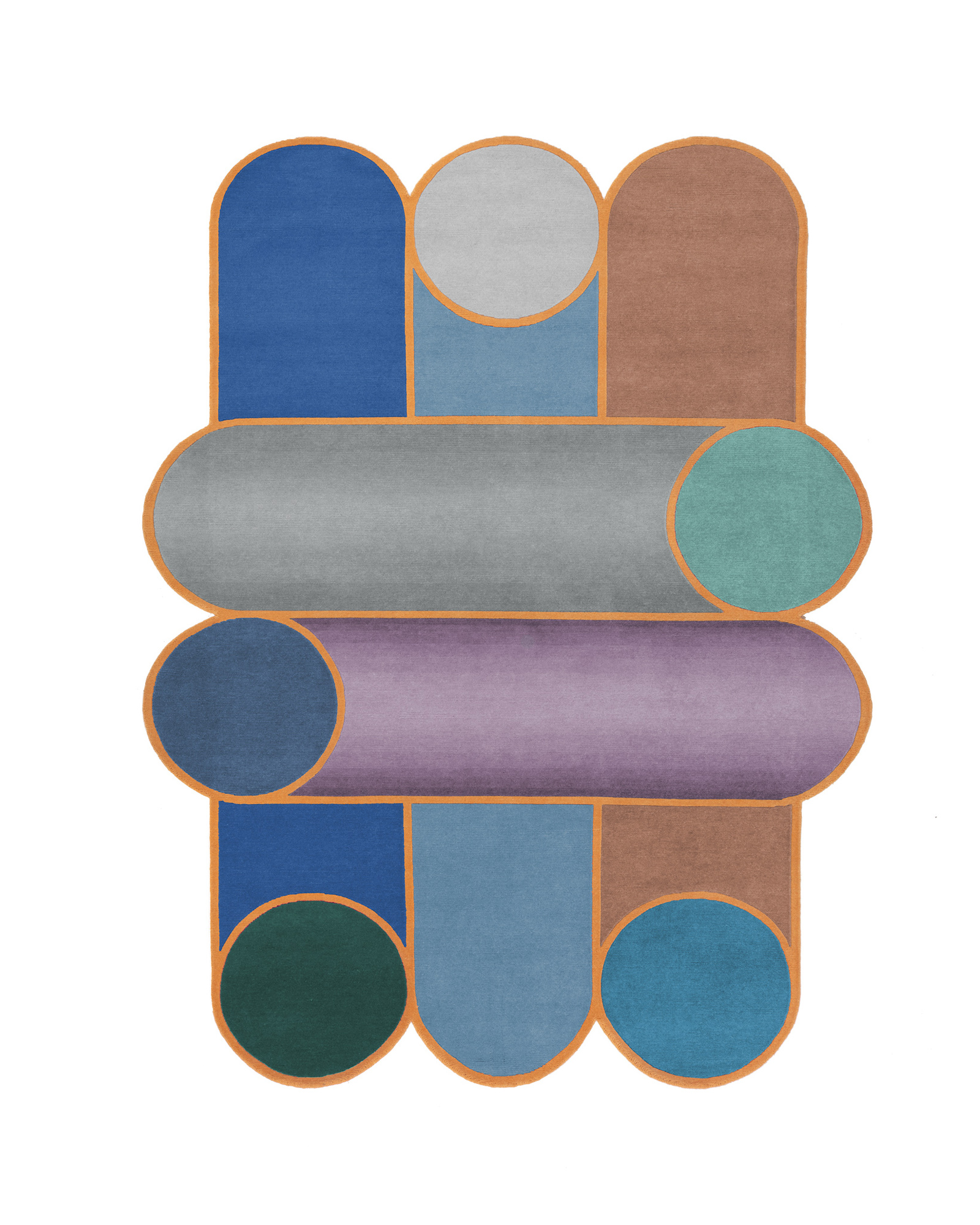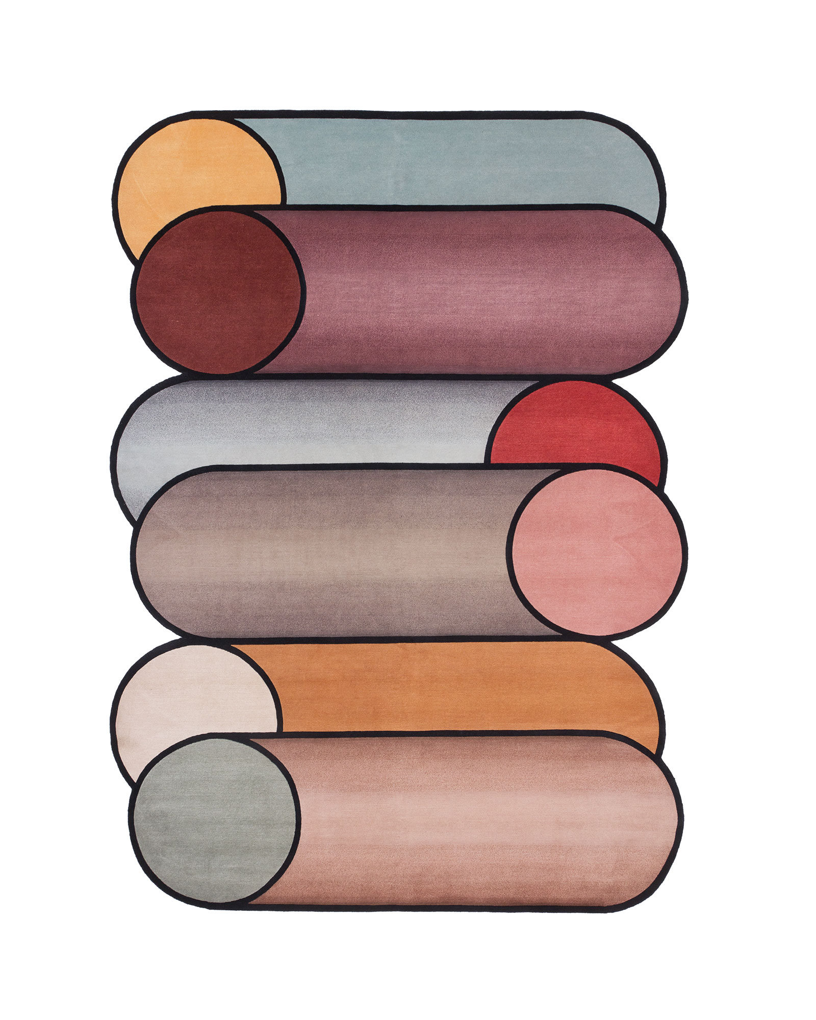 Rotazioni plays on the repetition of overlapping cylindrical forms that emphasize the circle as the matrix of the design. A scale of pastel colors and chromatic contrasts insinuate the gradient on the surface of the cylinders creating a three-dimensional effect. This enhances the volume and dynamic composition of the design: from this “Rotazioni” which translated means “Rotations” was born.