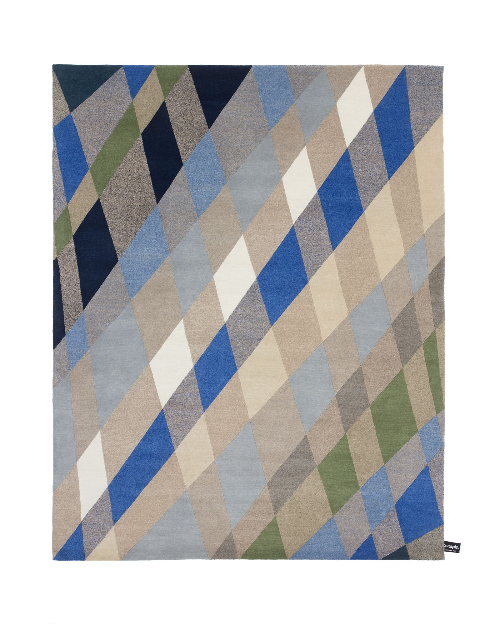 This carpet explores the many skills of the craft of carpet knotting. The various materials are knotted into intersections and crossings of techniques and colors. The weaving manifests itself in the various pile lengths and therefore creates a 3-dimensional texture.