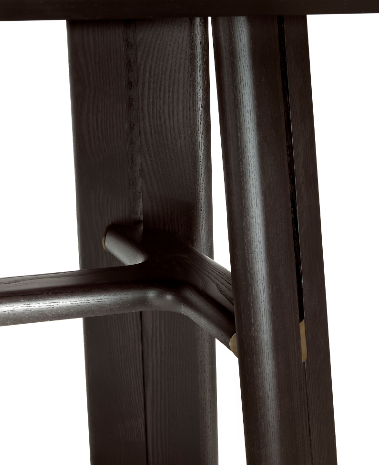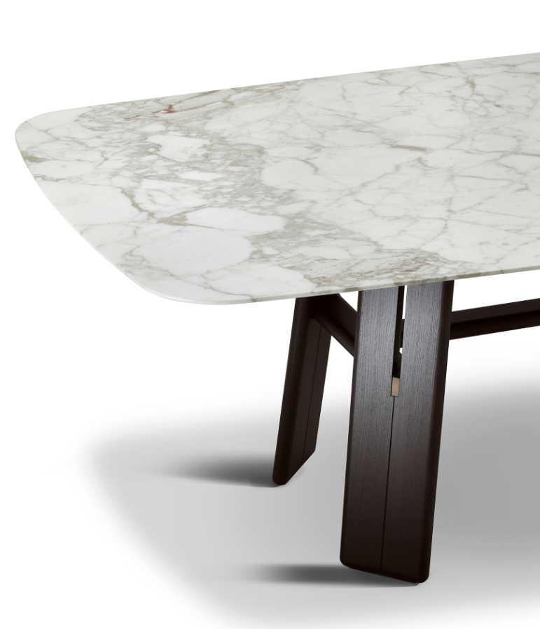 Il solido basamento in legno massello di frassino tinto Wengé o Moka, recupera e rielabora lo stile e il disegno dei tavolini DUO senza esserne l’esatta trasposizione. Infatti, le gambe sono composte da grandi tavole a sezione rotonda inclinata e collegate tra loro da una crociata con elementi in ottone bronzato. Il basamento sorregge il top di forma rettangolare o circolare in marmo Calacatta. DUO Table è il primo esempio a catalogo per Ceccotti Collezioni di un tavolo con piano in marmo mono-lastra libero senza cornice in legno.