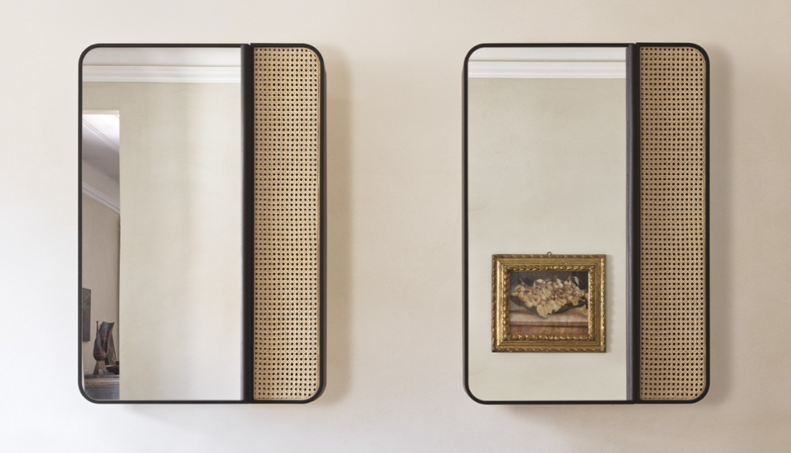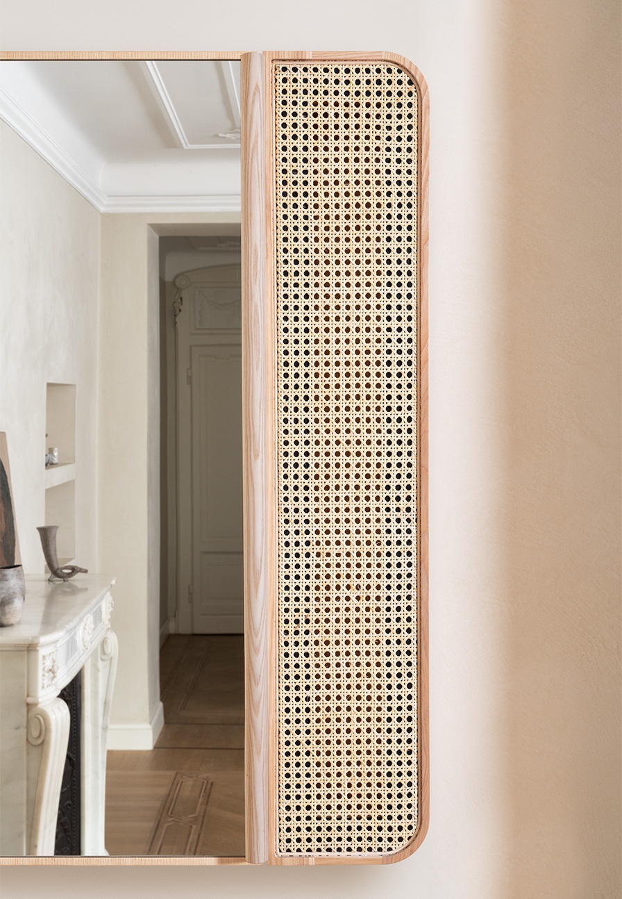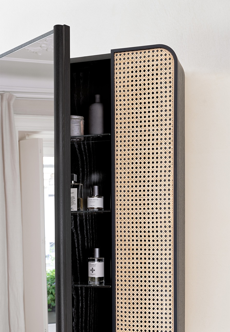 矩形鏡柜,帶雙門,天然或黑色染色實(shí)心白蠟?zāi)究蚣芎吞烊痪S也納稻草制成的右前門