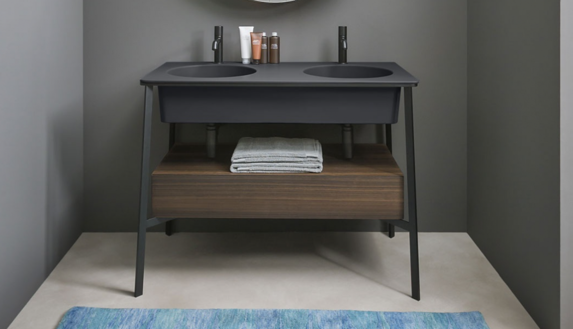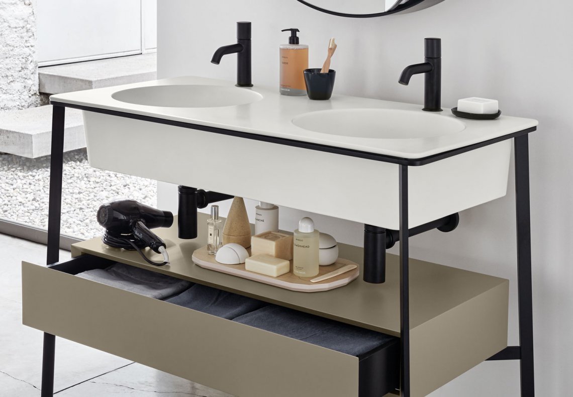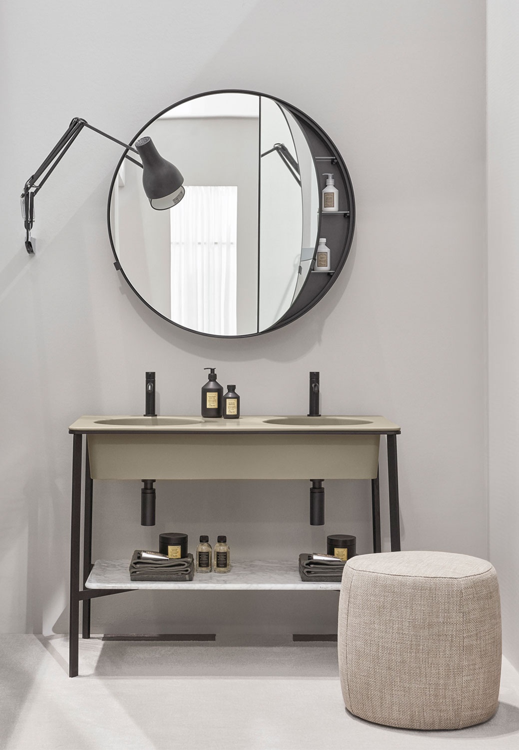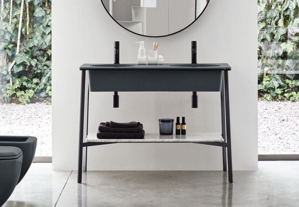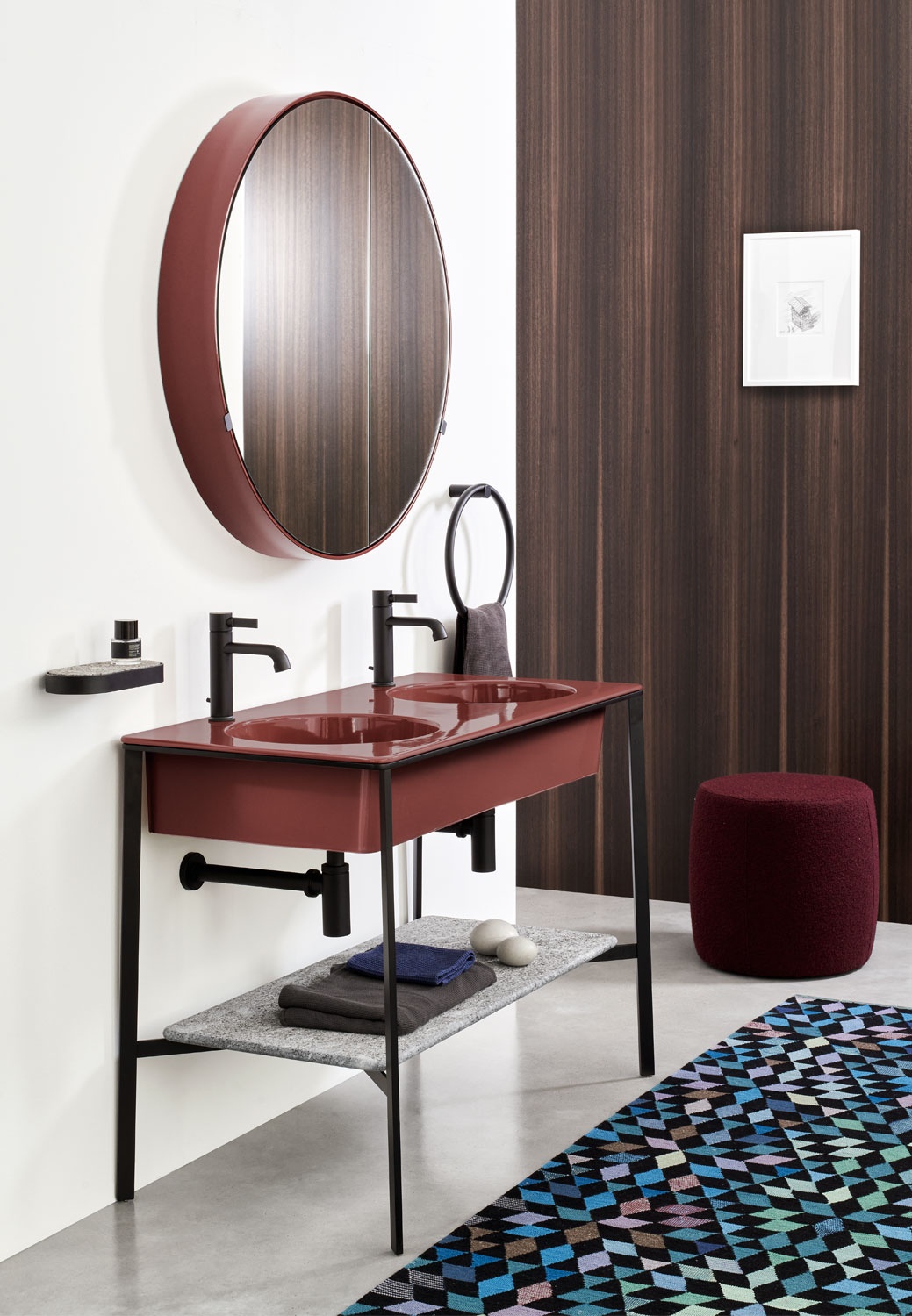 模塊化系統,帶實用的雙陶瓷盆,有多種飾面可供選擇,安裝在涂有不同飾面的鋼結構上,可選擇組合方便的漆木或大理石臺面或實用的抽屜容器,有漆飾面或精美天然色木質飾面。