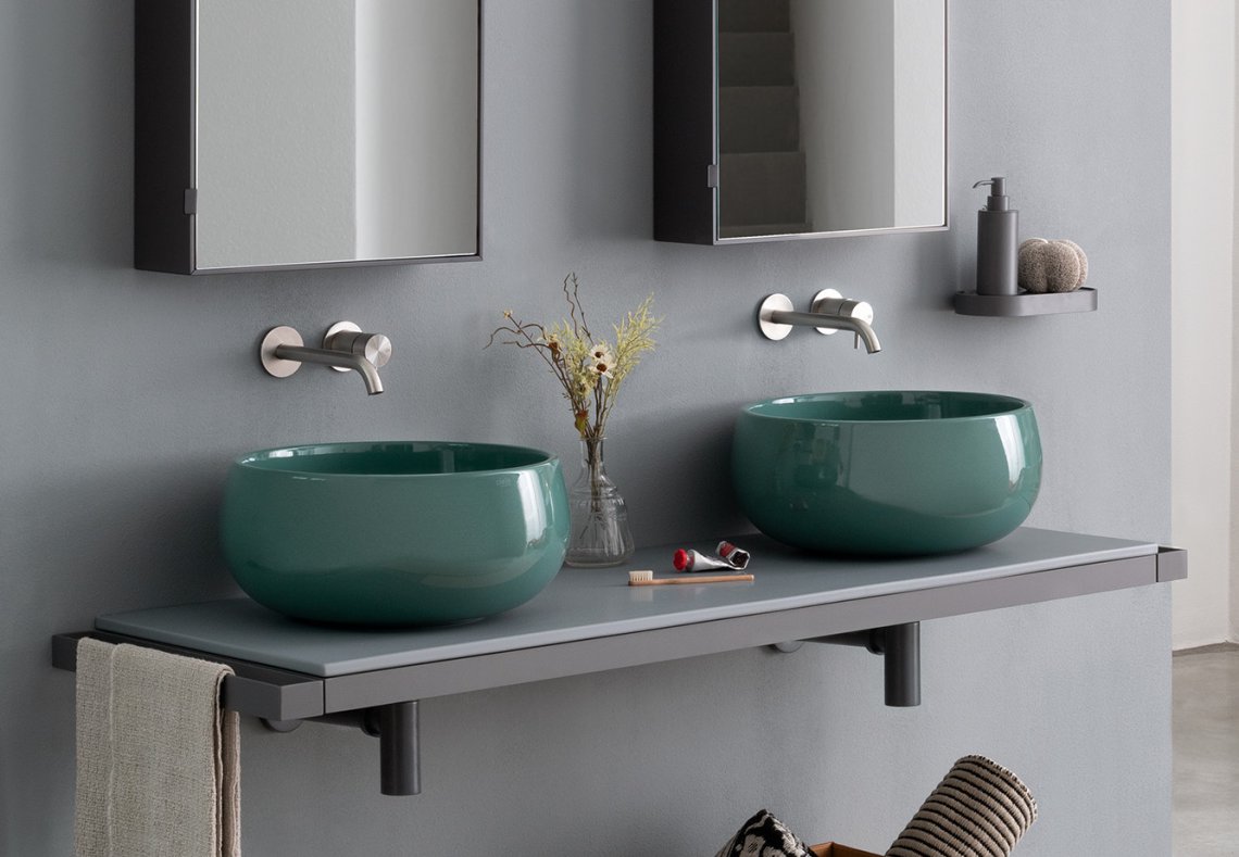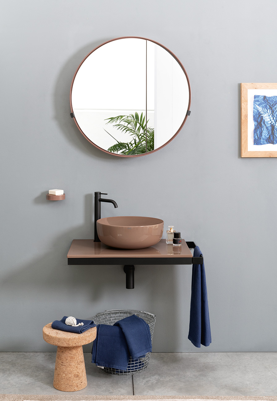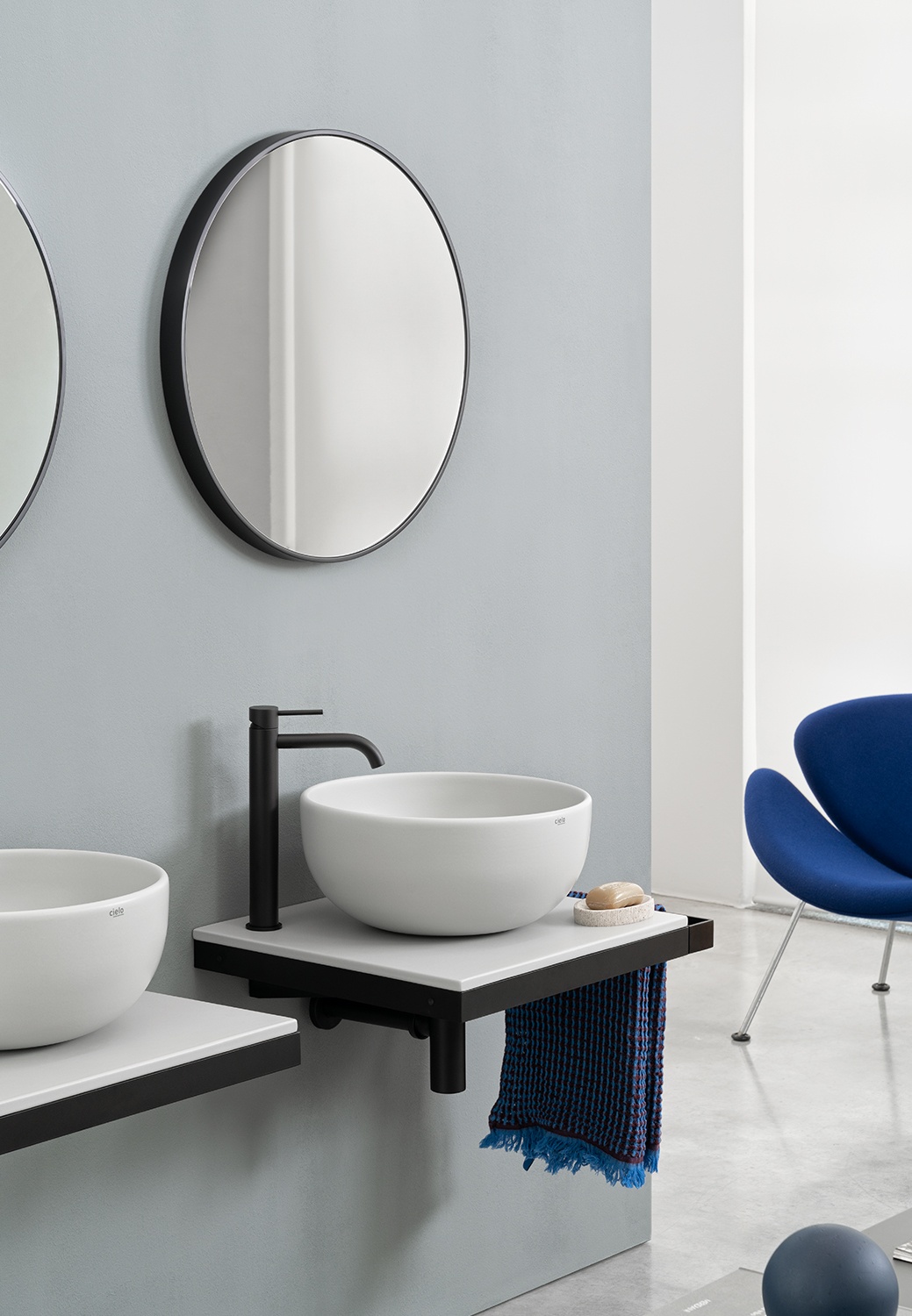 用于懸掛安裝的模塊化系統(tǒng),有多種尺寸,由陶瓷臺面組成,有多種飾面,安裝在涂漆鋼結(jié)構(gòu)上,并可以添加毛巾架作為補充。