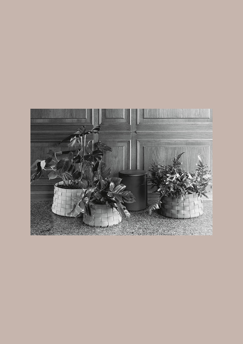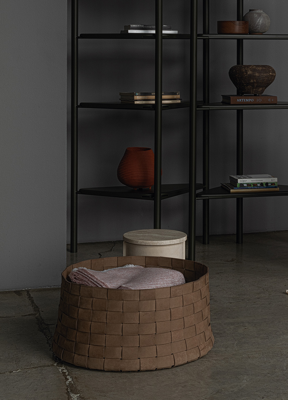 Dama container with black painted wooden base. Woven leather structure with special raw cut edges finishing available in three different leathers: Soffio, Setanil and Natural Velour. If no preference is specified, the edges feature tone-on-tone lacquering. Dama contenitore con base in legno verniciata nera. Struttura in pelle intrecciata con finitura cuoio disponibile in tre tipologie di pelle: Soffio, Setanil e Natural Velour. I bordi sono realizzati tono su tono se non viene specificata alcuna preferenza.