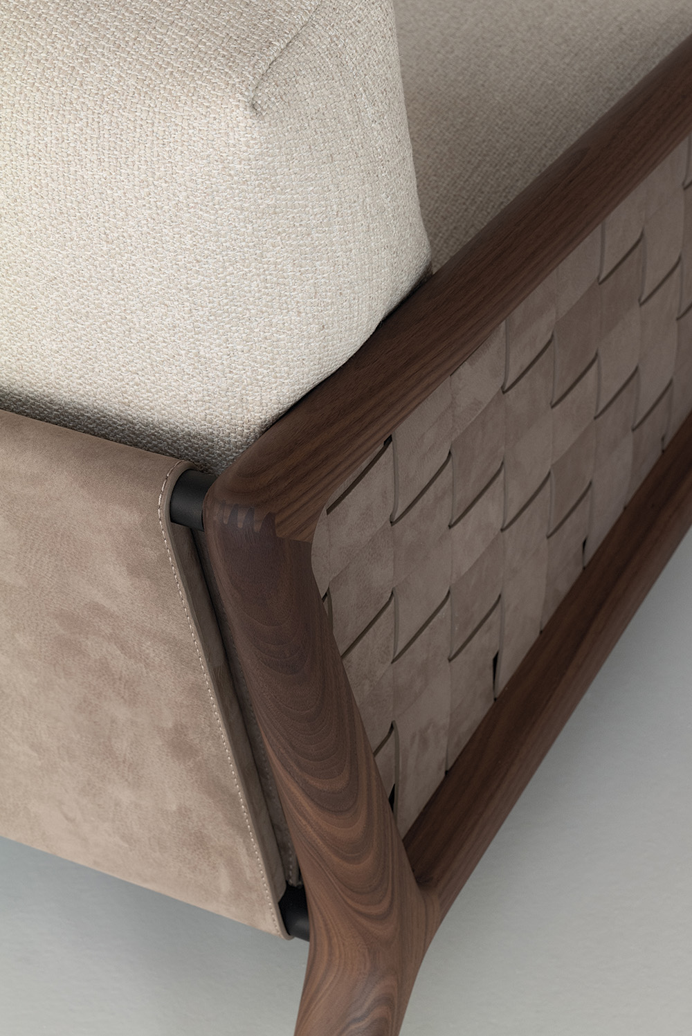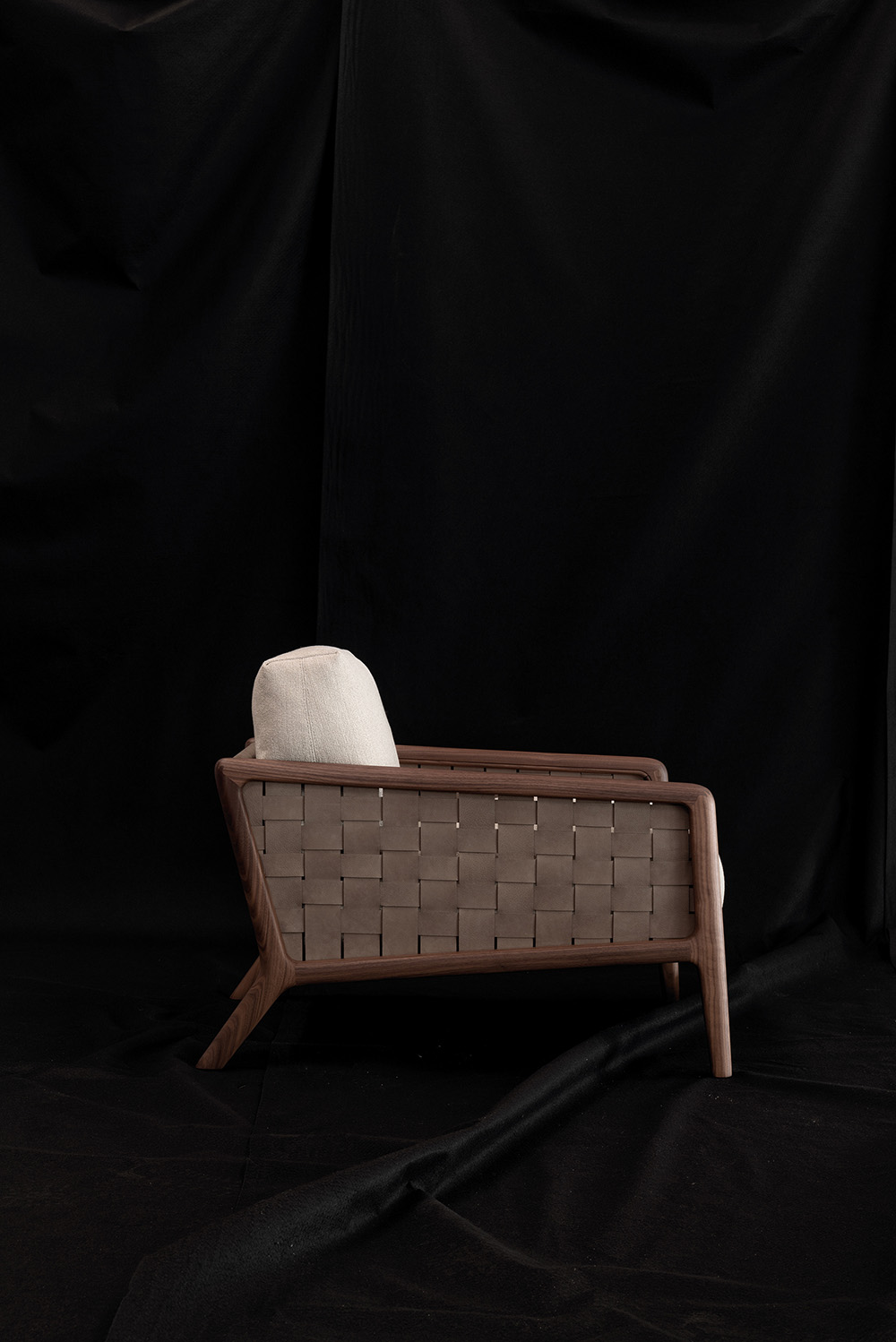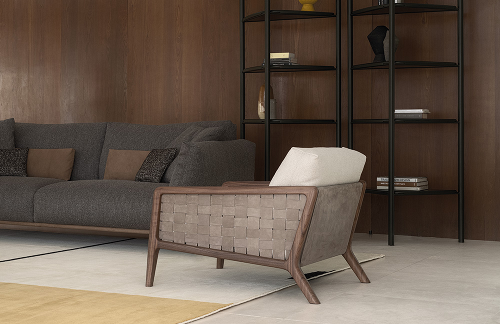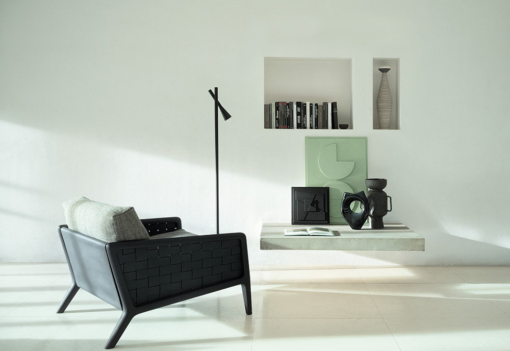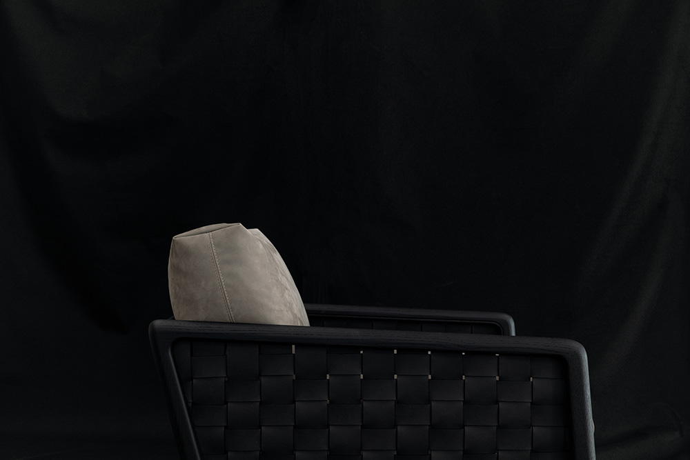 MOTIFS ENDLESSLY REPEATING THEMSELVES, WEAVES WITH NO FORESEEABLE CLOSURE. IOLE HOLDS IDEAS, AS THE HAND CARESSES EACH CARVING ON THE LEATHER, LIKE RIPPLES ON WATER. MOTIVI CHE SI RIPETONO ALL’INFINITO, INTRECCI DI CUI NON SI CONOSCE L’ESITO. IOLE OSPITA I PENSIERI, MENTRE LA MANO SCORRE TRA GLI INTAGLI DI UNA SUPERFICIE DI PELLE, INCRESPATA COME LA SUPERFICIE DELL’ACQUA.