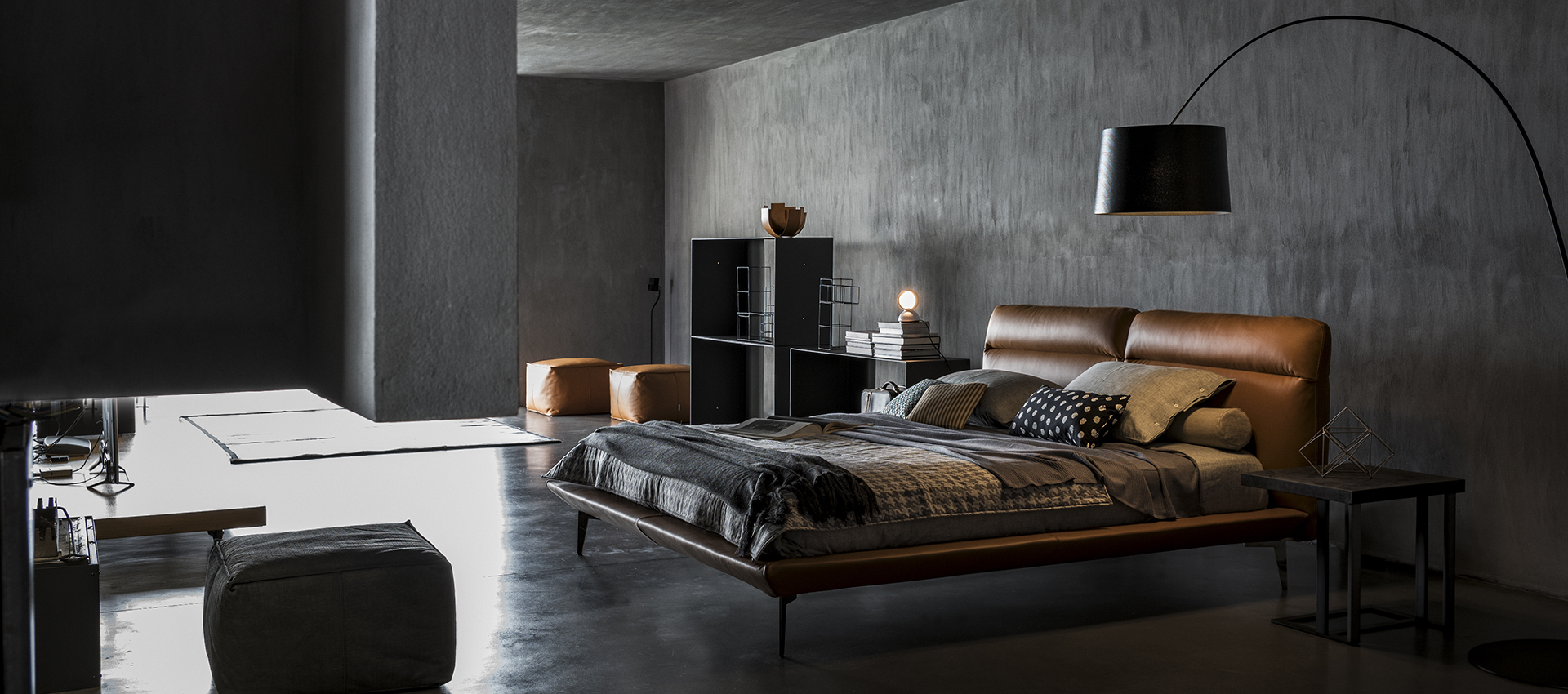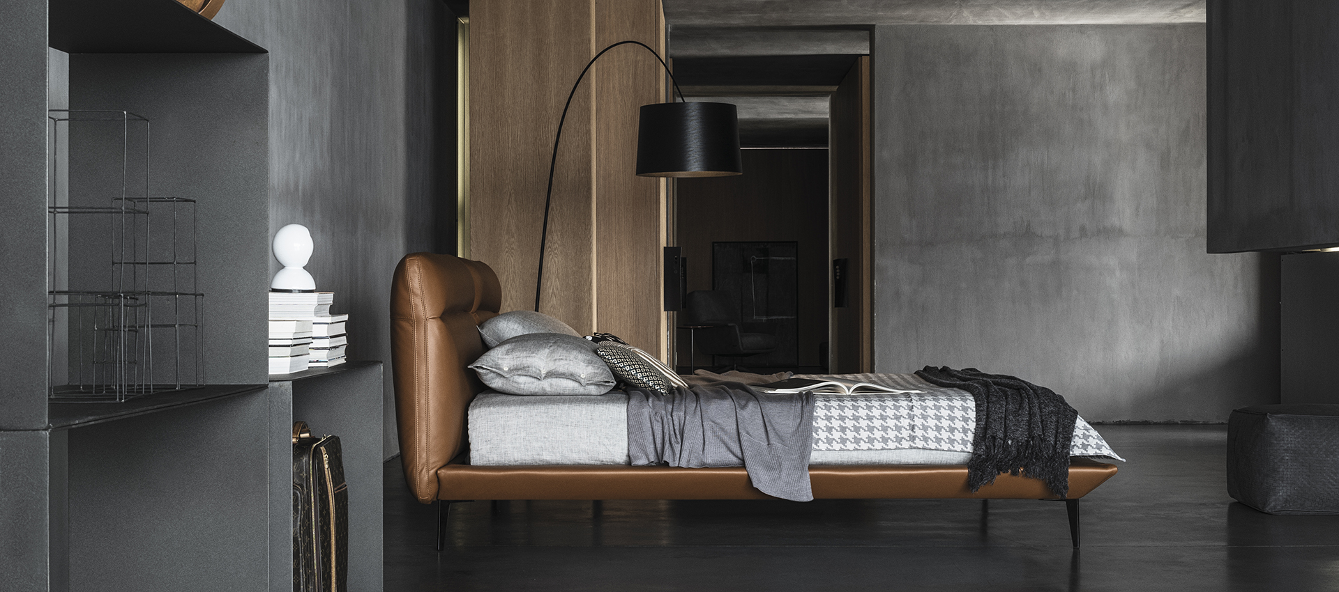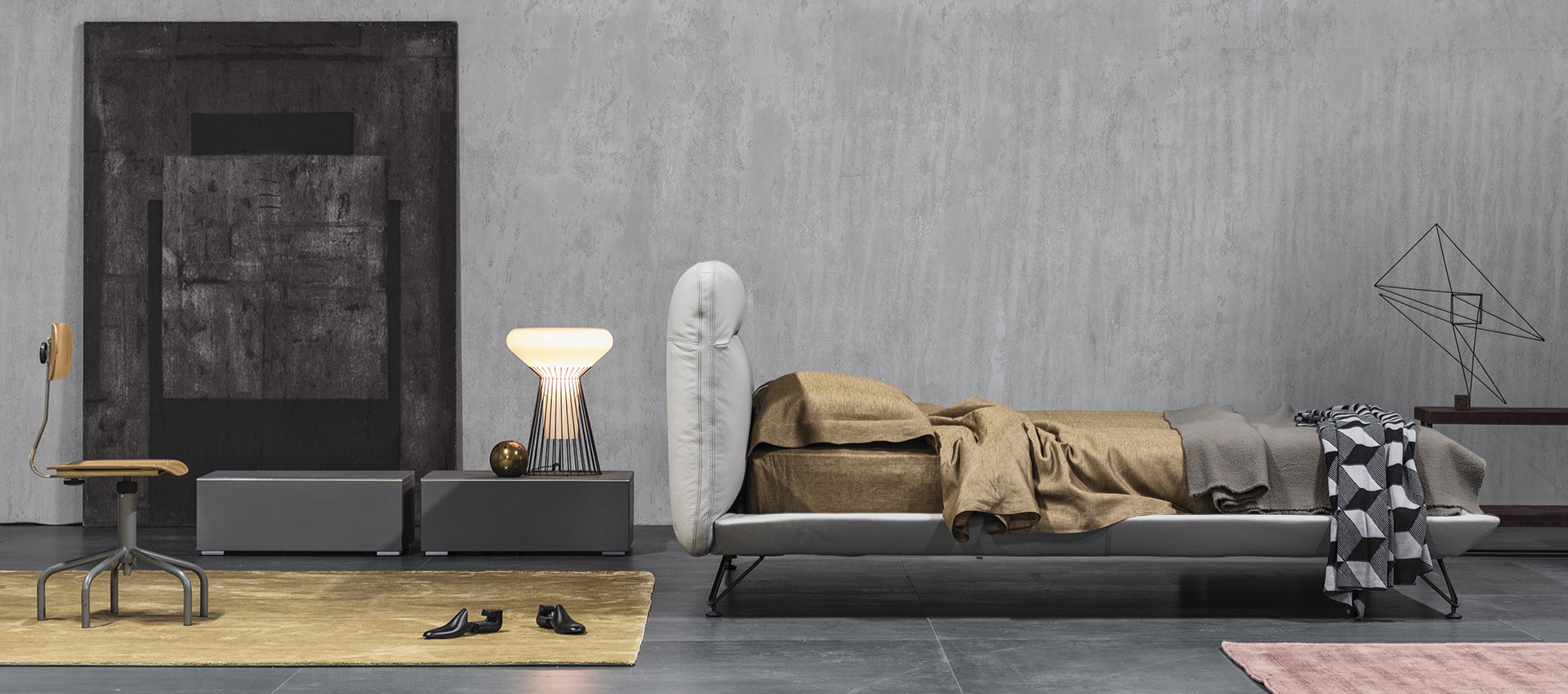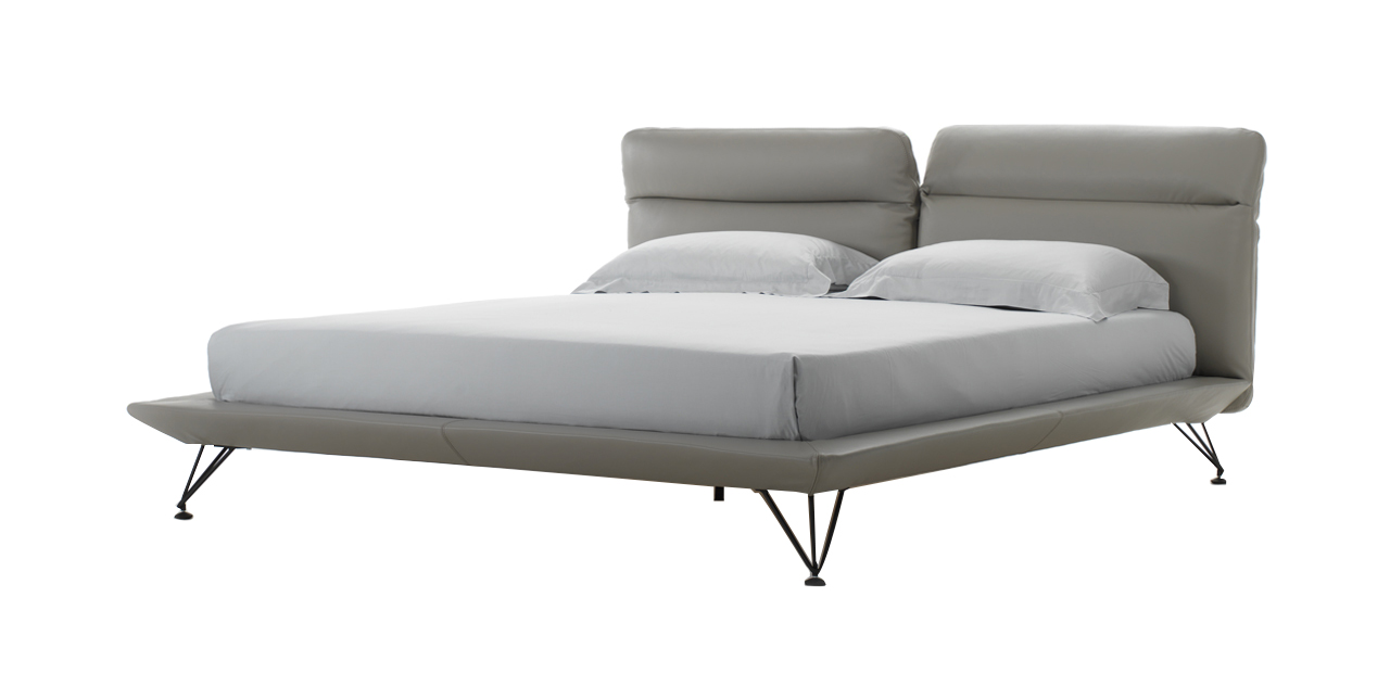 Bed with reclining metal headboard upholstered in polyurethane foam