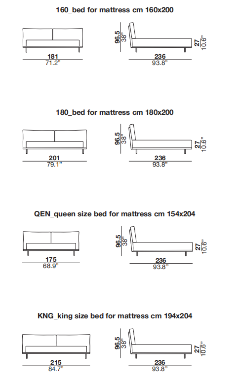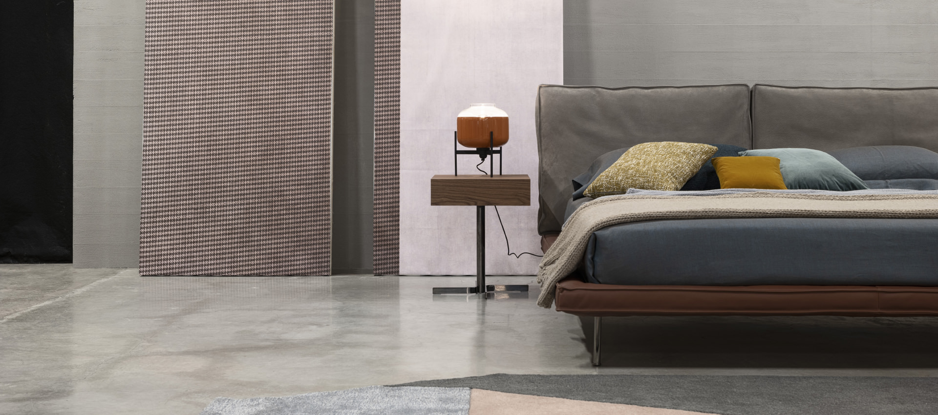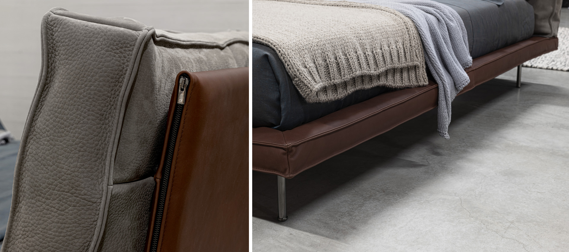 Headboard cushion in silicone-coated microfibre. The frame of the sommier is made of metal