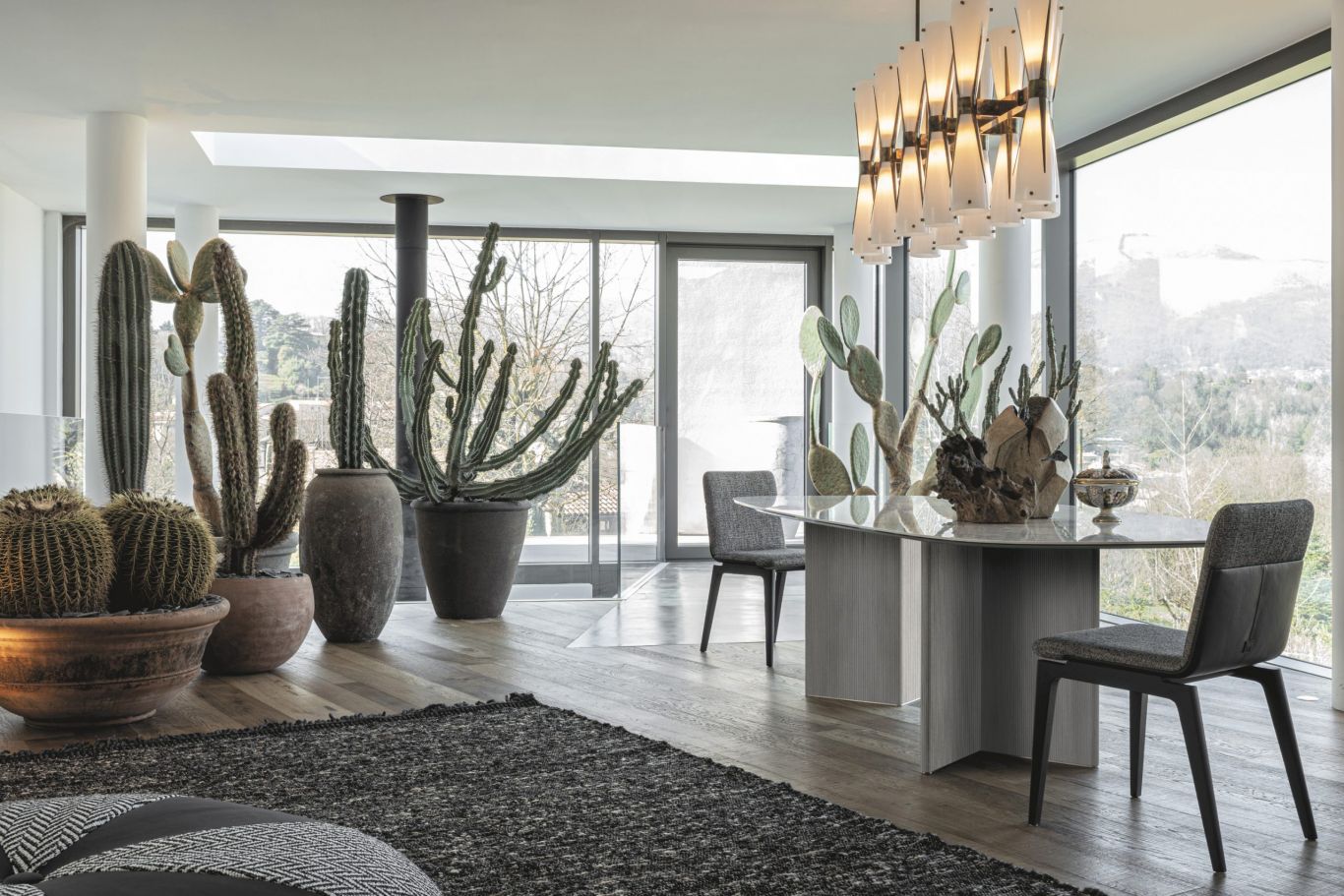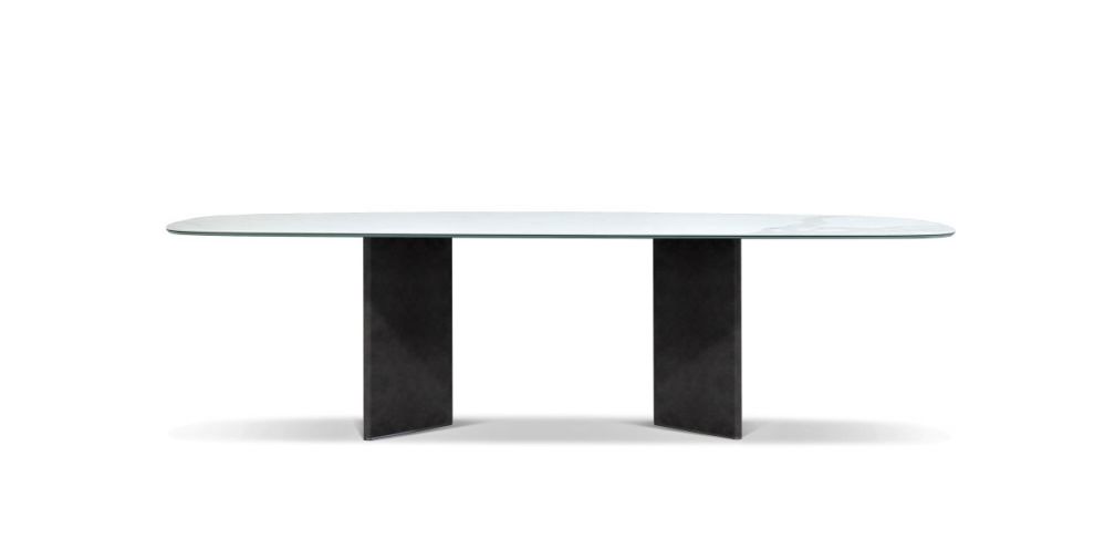 Glamour e chic. La forza del tavolo Wings è nelle due basi rivestite in pelle, ma l’eleganza è nel suo piano in effetto marmo.