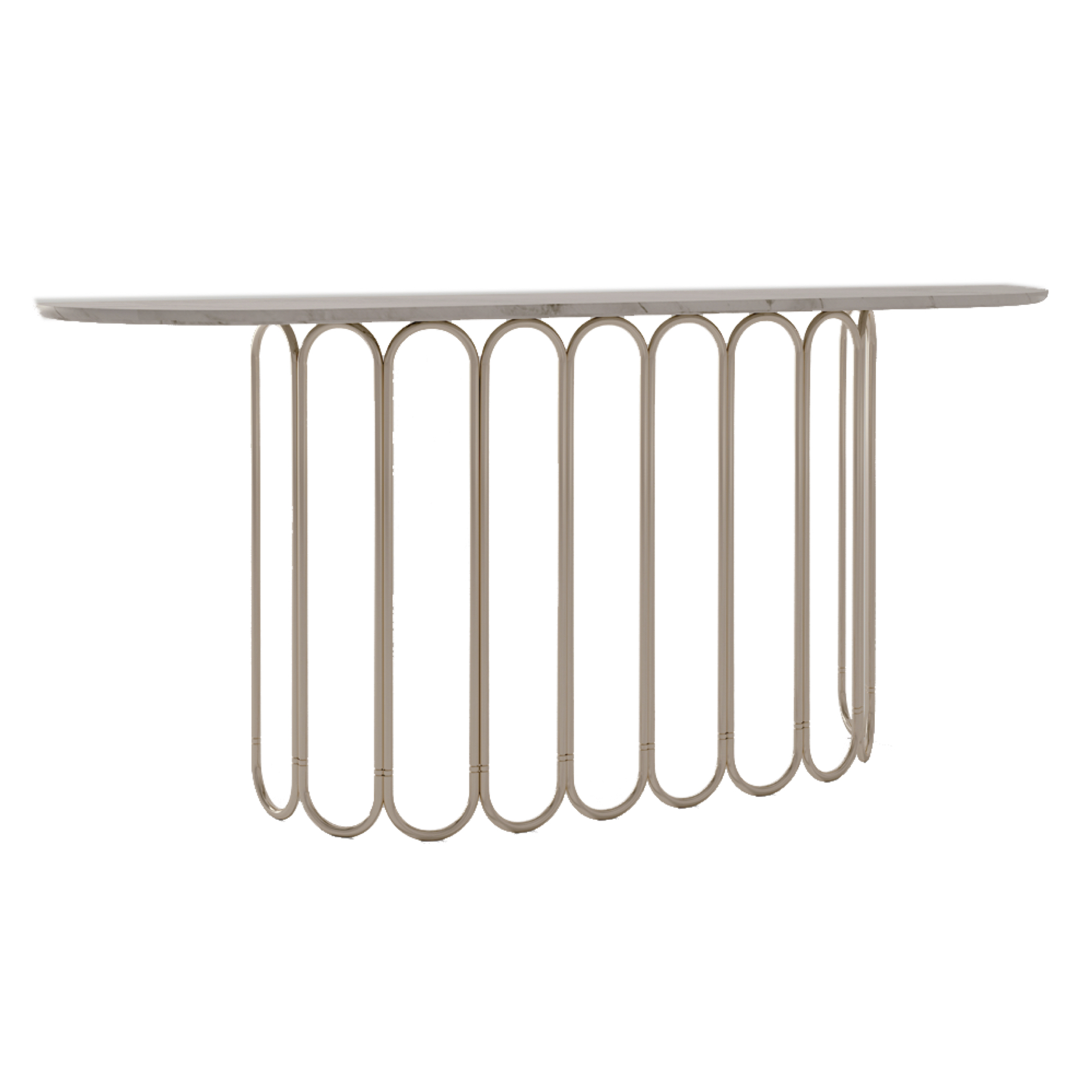 Base in tubolare di metallo. Supporto top in legno laccato. Top in marmo.