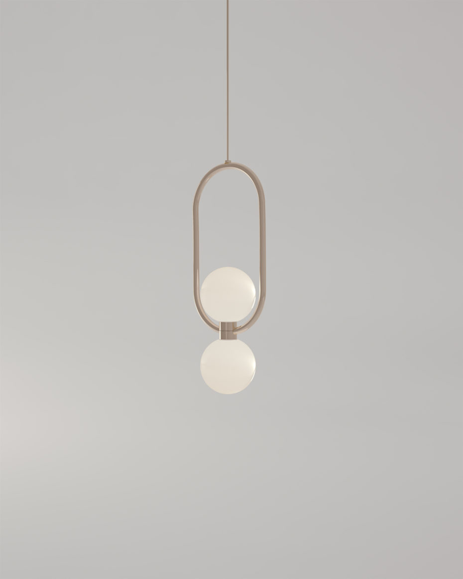 Struttura tubolare metallica. Sfera in vetro opale. Cavo in maglia metallica finitura bronzo. Lampadina LED G9 220 volt.