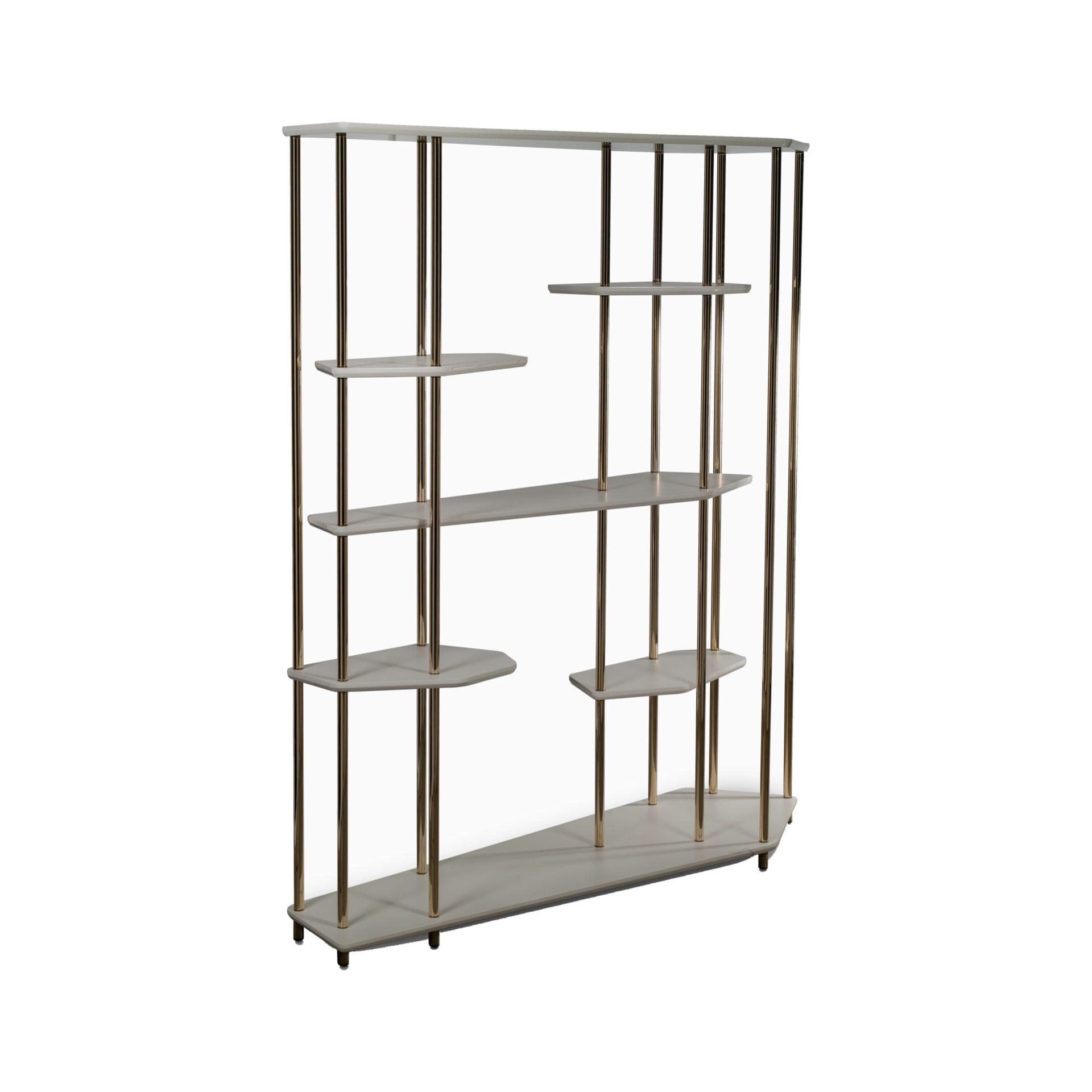 Struttura in tubolare metallico. Ripiani in legno laccato con top in radica.