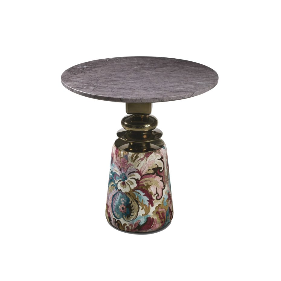 Struttura base in legno di pioppo rivestita in pelle o tessuto non sfoderabile. Componenti in Ottone. Top in marmo.