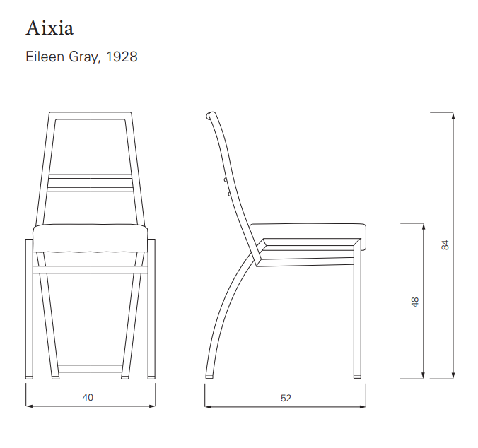 Aixia was one of Eileen Gray‘s personal favourites. She used this chair in all of her apartments, sometimes in the dining room, sometimes at a desk. Even in 1929, when she converted a 40 m2 apartment in Paris, Rue Chateaubriand, into an atelier of brilliant aesthetic and fascinating functionality for Jean Badovici, Aixia was among the furnishings. The chair is named after the company that produced the steel tubing for Eileen Gray‘s avant-garde designs.