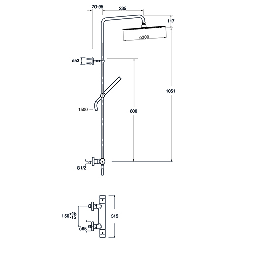 Wall-mount shower column, with thermostatic mixing, diverter with 2 outlets, SANDWICH SPECIAL*** anti-scale rain effect showerhead, ?300 mm, adjustable arm, anti-scale mini showerhead, sliding support and long-life hose