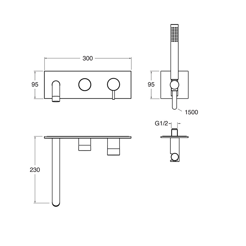 Single-control wall-mounted external set for bathtub, metal plate, with mechanical mixing, diverter with 2 outlets, spout length 230 mm, fixed support, water outlet, anti-scale mini showerhead and long-life hose ****. For completion with recessed part CRICS100 (dx) / CRICS101 (sx)