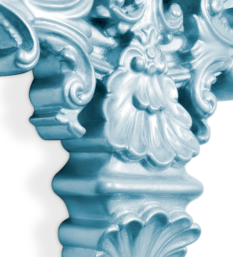 Made entirely by hand, using traditional techniques of carving, it features silver leaf finishes with pink translucent varnish applied.