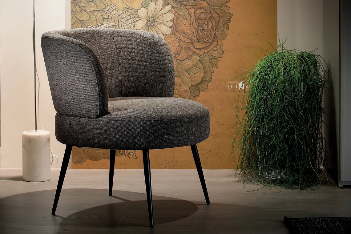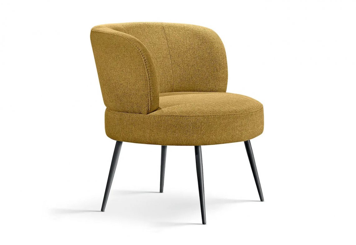 Annie is a low armchair with enveloping and padded backrest, thin metal legs and customisable coverings. Its retro lines make it a design object capable of enhancing any room.