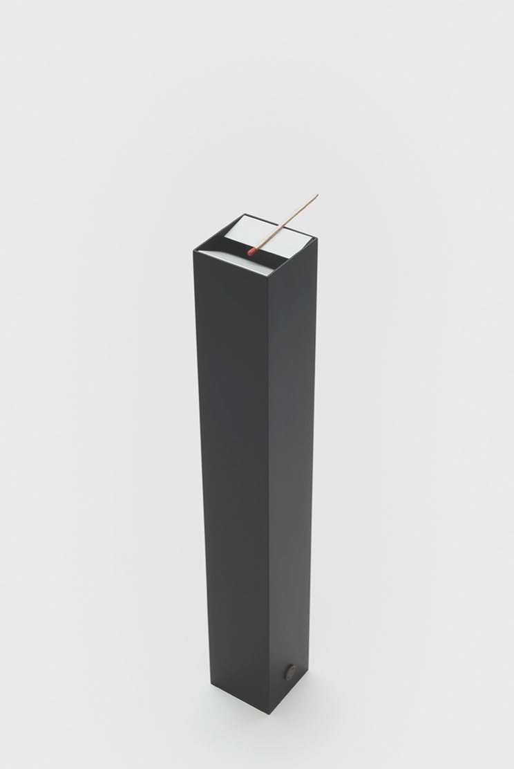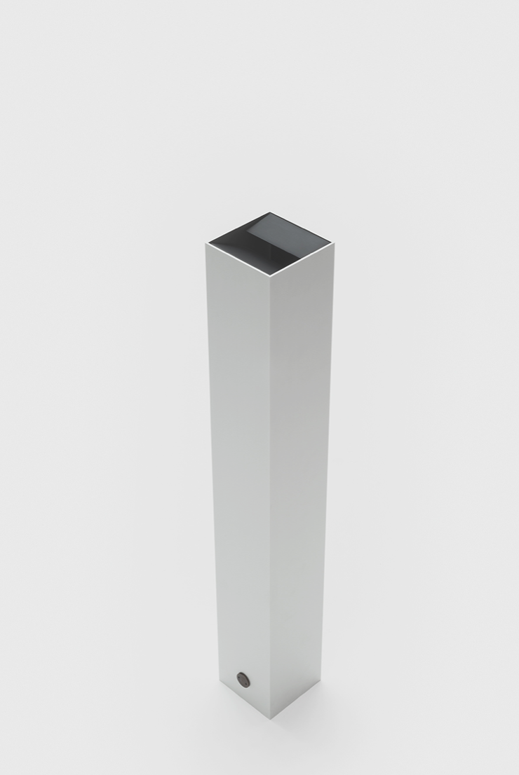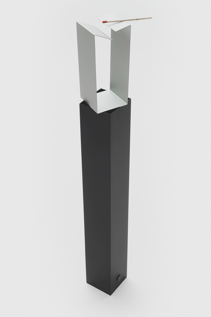 Ponza is a standing floor ashtray. A bent sheet of aluminium is inserted into a square-shaped metal tube and can be removed so that the contents can e emptied.