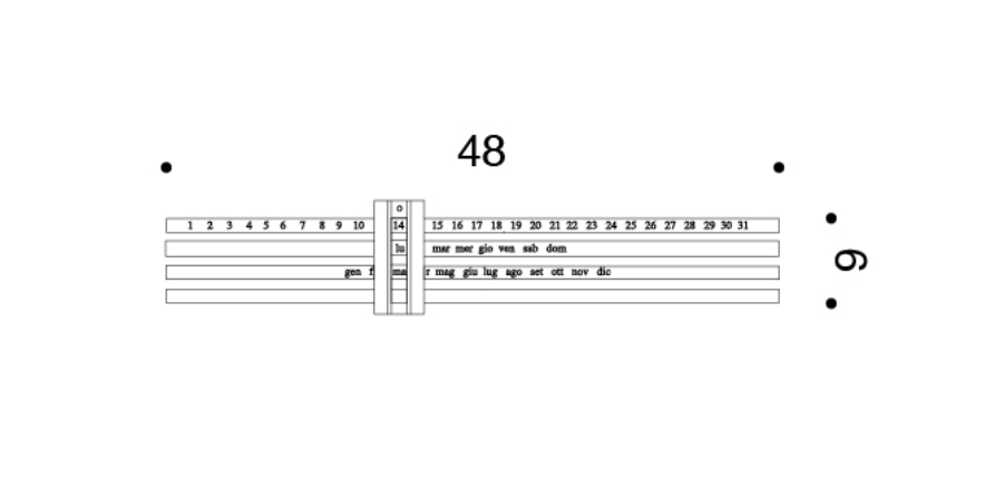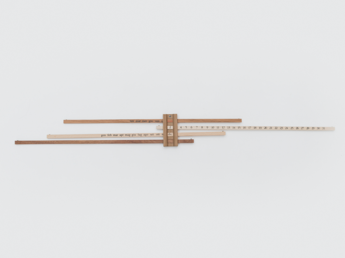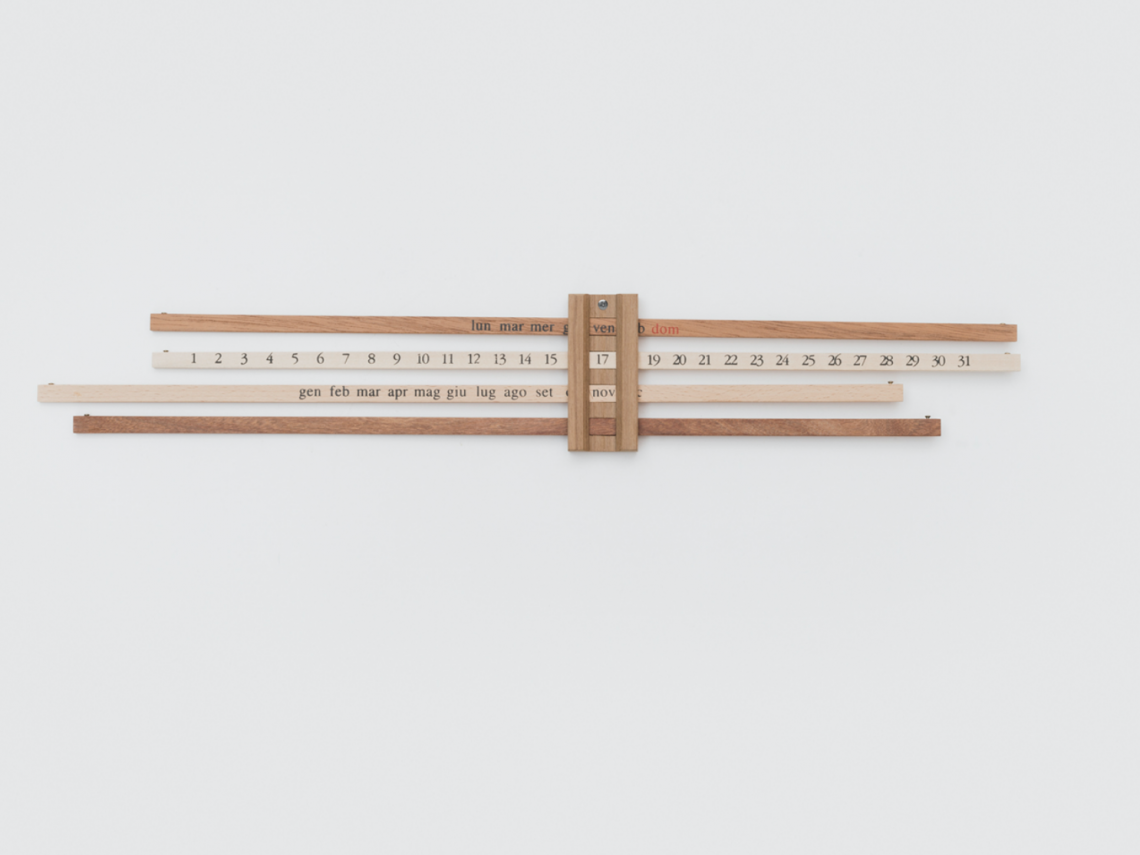 Calendario bilancia is a wall calendar that underlines the passing of time thanks to the human intervention needed to methodically change the date each and every day. It consists of four horizontal strips of different woods printed with either the days of the week, the months or dates. These strips slide through a single central wooden pivot, which frames the date combination. The structure plays on the equilibrium of the thin wooden strips and turns the usual function of a set of scales on its head, turning it into a calendar.