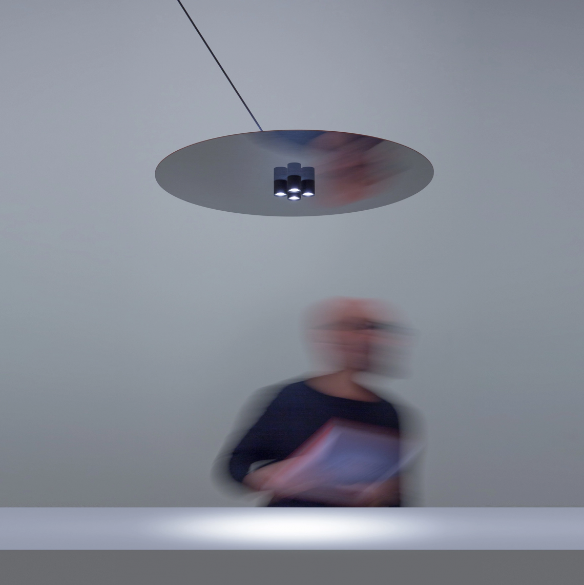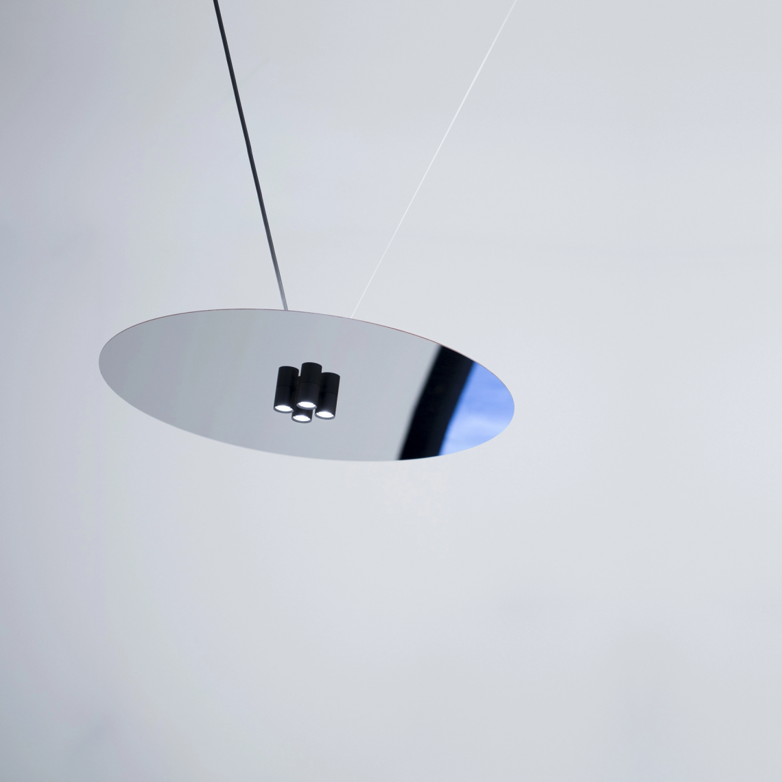 A thin, circular mirror is suspended to provide soft and soothing light, combining both direct and indirect lighting. A homage to one of the founders of modern optics. A sophisticated clamping system is used to position the disc wherever you want, without the need for wall or ceiling wires.