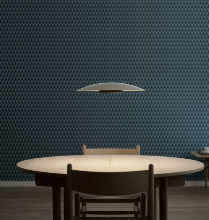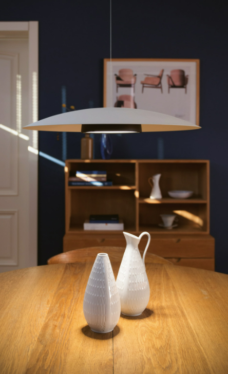 The light source is applied magnetically to a metal dish that hangs from the ceiling using a very thin steel wire. The effect is delicately elegant.