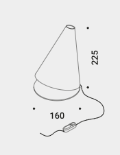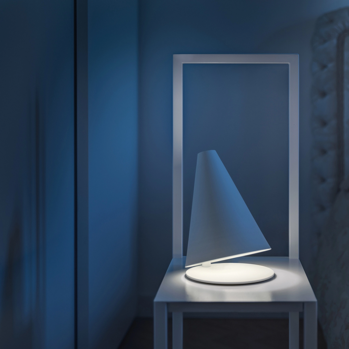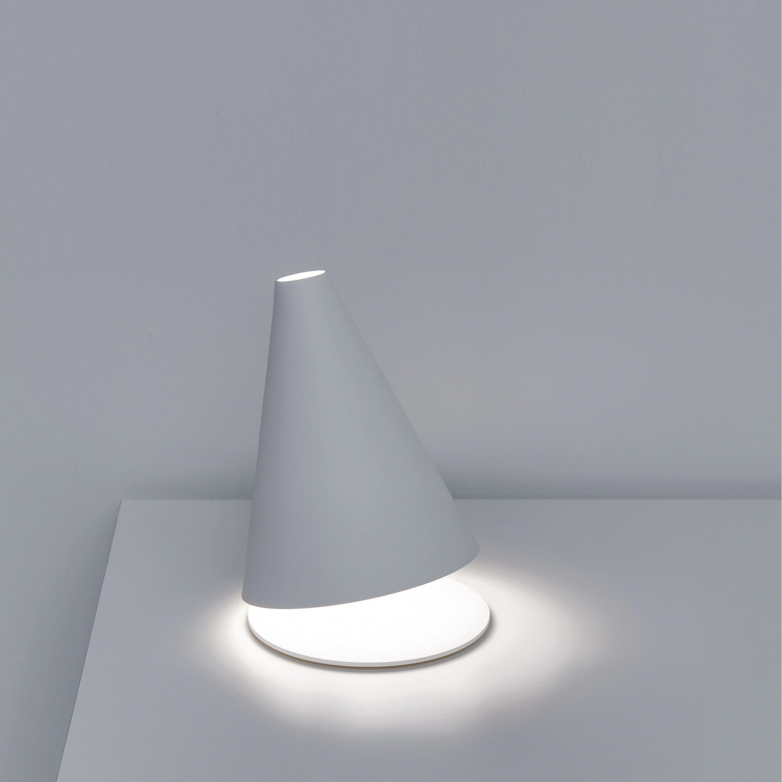 A table lamp, designed to create lighting with a high visual impact. A metal cone positioned diagonally on its base creates an asymmetrical light beam.