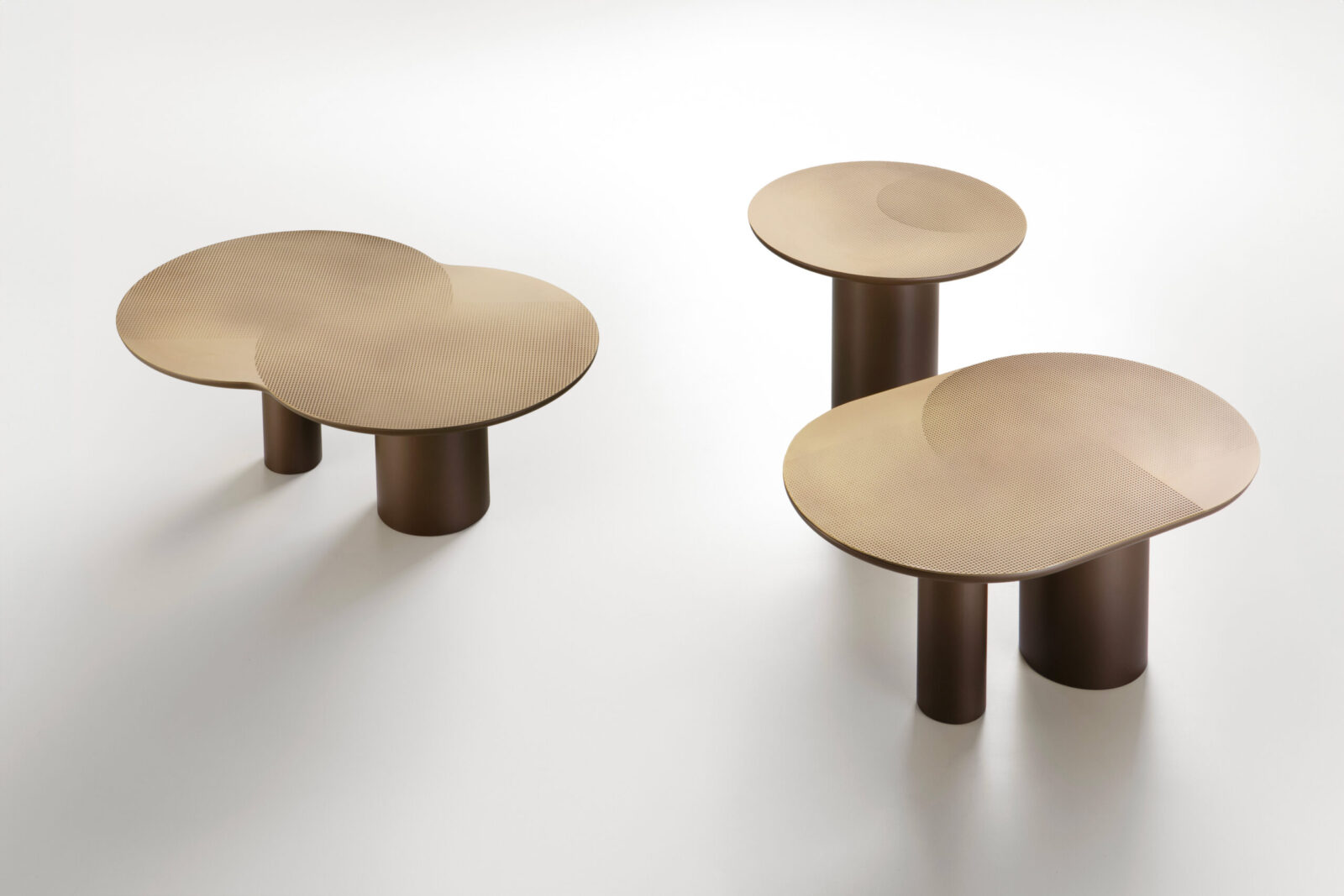 La collezioni di tavolini Flocks si ispira al movimento sinuoso e ipnotico degli stormi nel cielo autunnale. I top dei tavolini sono realizzati in lastra di ottone o rame, dalle forme circolari semplici o intersecate, che poggiano su uno o due cilindri di diversi diametri. Il contrasto cromatico è accentuato dal pattern grafico ottenuto con la finiture DeErosion che caratterizza il top regalando una sensazione tattile tridimensionale che affiora sulla lastra con naturale raffinatezza.