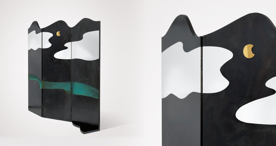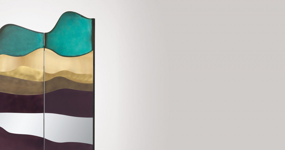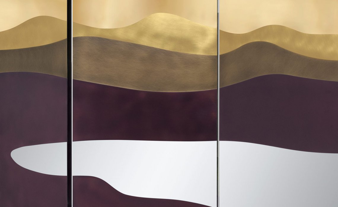 A large screen designed as a theatre curtain represents imaginary natural landscapes on both sides: a night sky and the outline of a series of hills. The chromatic variations obtained thanks to the different surface oxidations resemble the colours of a painting on canvas, with the resulting image becoming a stage backdrop. Brushed copper and DeLabré brass shape the outlines of a distant space, while the textural black of the sheet metal juxtaposes with the airy verdigris in the imaginative construction of a changing landscape.