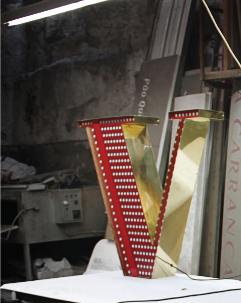 Grab the Las Vegas feeling inside or outside your design project! Inspired by the aura and authenticity of the city of lights this sophisticated lighting design has a copper plated and red frame that can be customizable on demand. Available in a mini version, the vivid colours reflect a state of being, creating an energetic atmosphere. Handmade in copper and acrylic. Versatile, you can put this lighting design on the wall or on the floor. Fitting for outdoors as well.