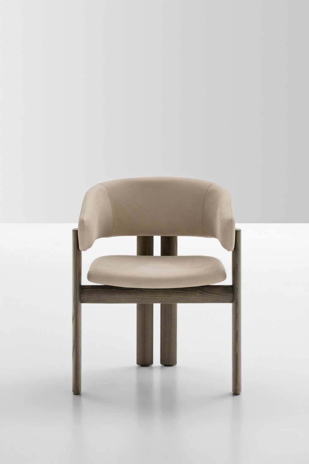 Attractive and refined shapes give rise to a composition comprising a table – in various sizes – and a chair – covered with leather or fabric. An original and concurrently classic look for the set, like an urban landscape which harmoniously brings together different souls.