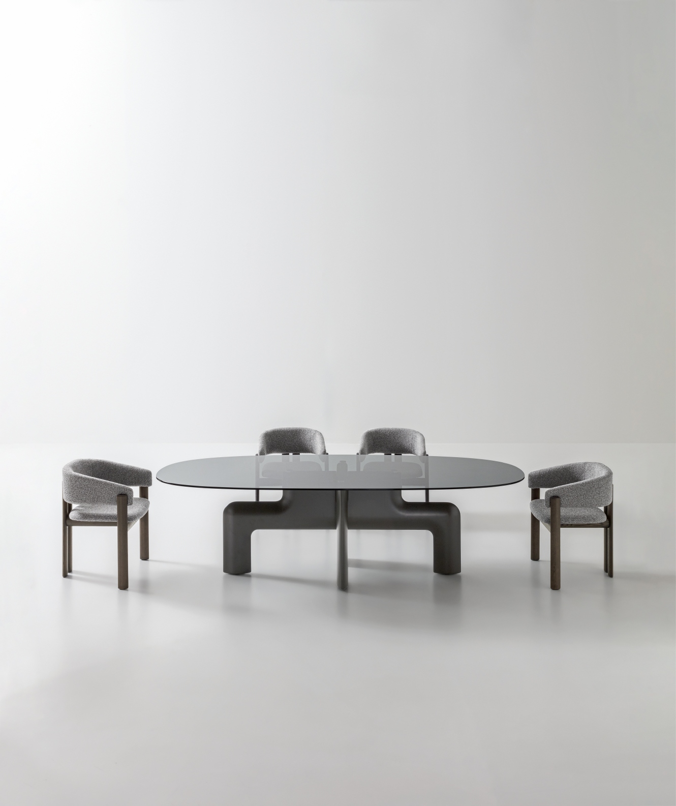 Forme accattivanti e raffinate danno vita a una composizione di tavolo – in diverse dimensioni – e sedia – rivestita in pelle oppure in tessuto. Un insieme dal sapore originale e classico al tempo stesso, come un paesaggio urbano che unisce con armonia anime differenti.