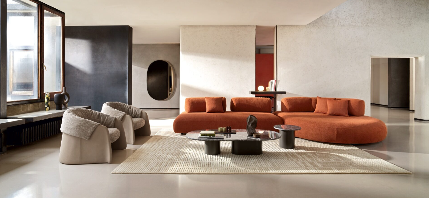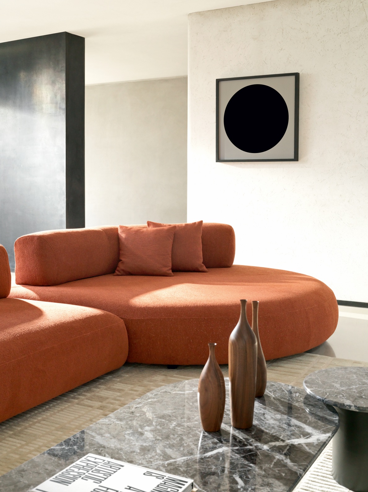 Dalla libertà di composizione e dal desiderio di informalità nasce un divano che è un arcipelago di forme arrotondate. Isole come sedute accoglienti e con morbidi cuscini da disporre a piacere, tra cui uno schienale ad angolo variabile che caratterizza l’insieme e si adatta ai corpi e allo spazio.