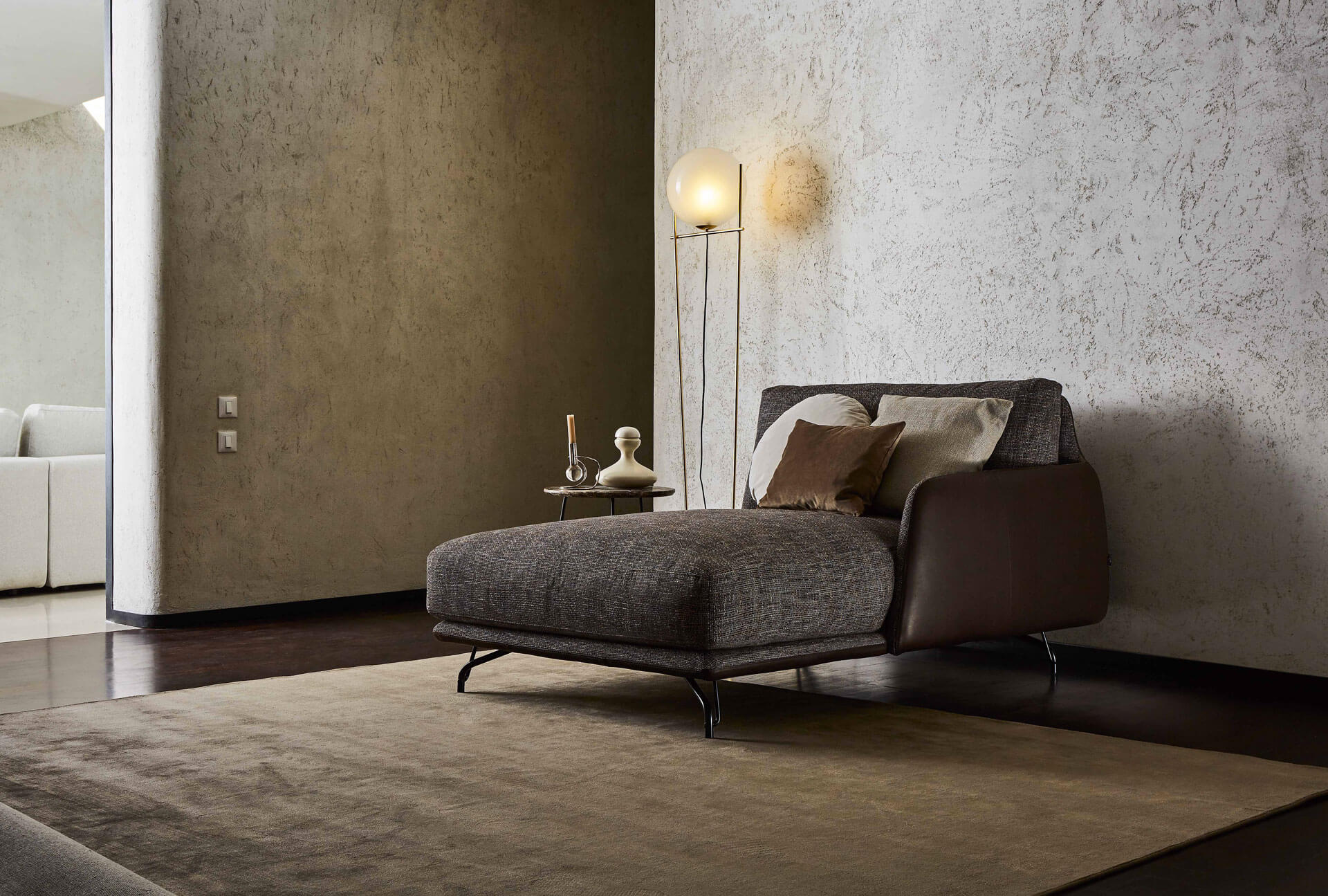 Elliot還提供皮革與織物混合的解決方式,根據需要選擇各種版本的支腳。獨一無二的模塊:原創填料沙發凳可以當座椅使用,也可以用作支撐部件,配噴漆金屬平板。