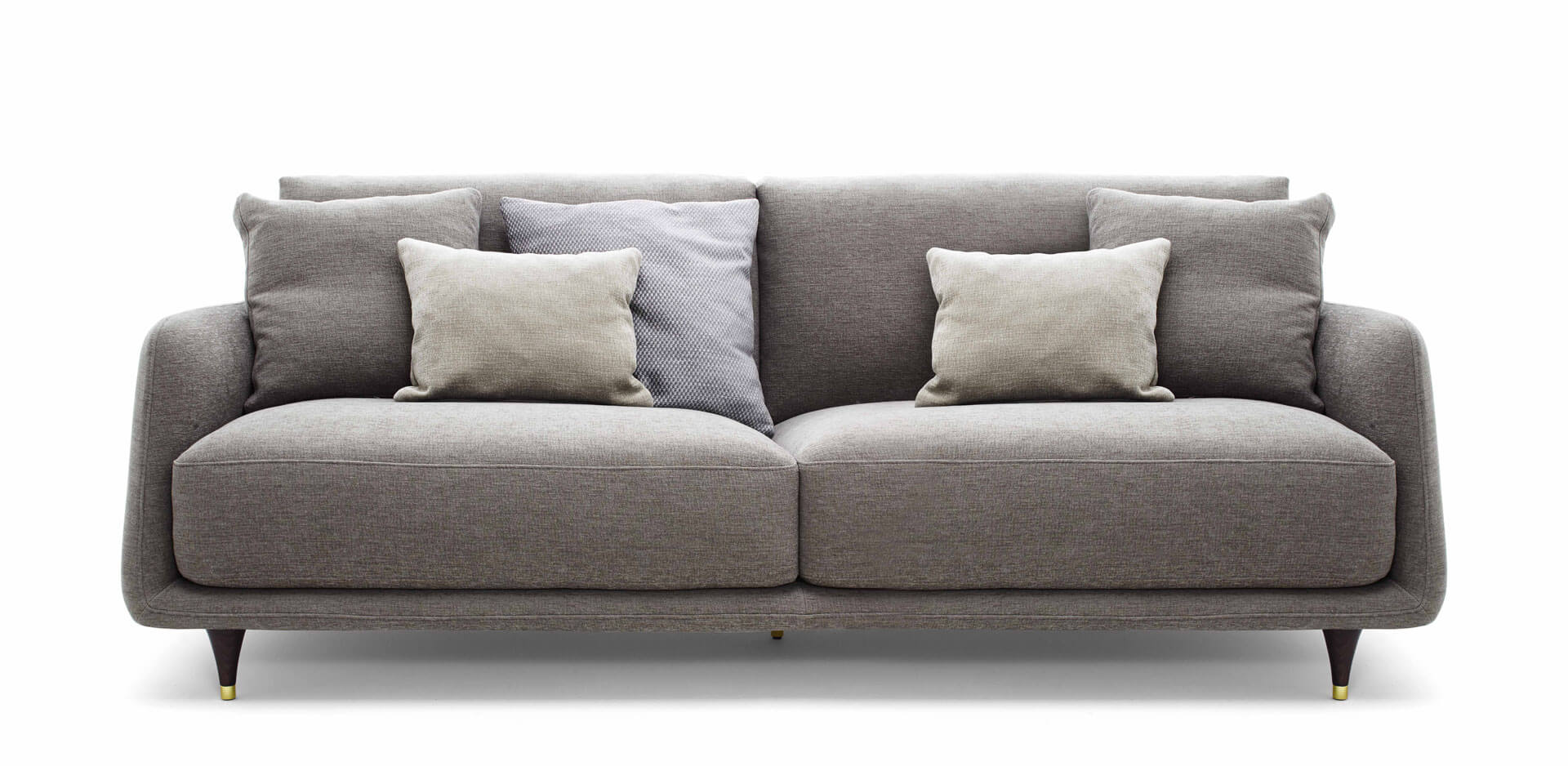 沙發簡潔優雅而純粹,鮮明的復古細節裝飾,例如與靠背連為一體的扶手的柔和曲線,或是木制支腳及黃銅腳尖。