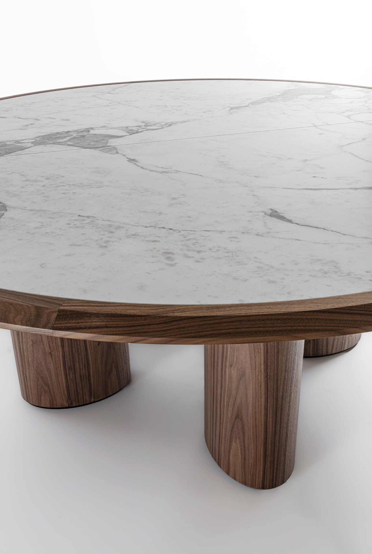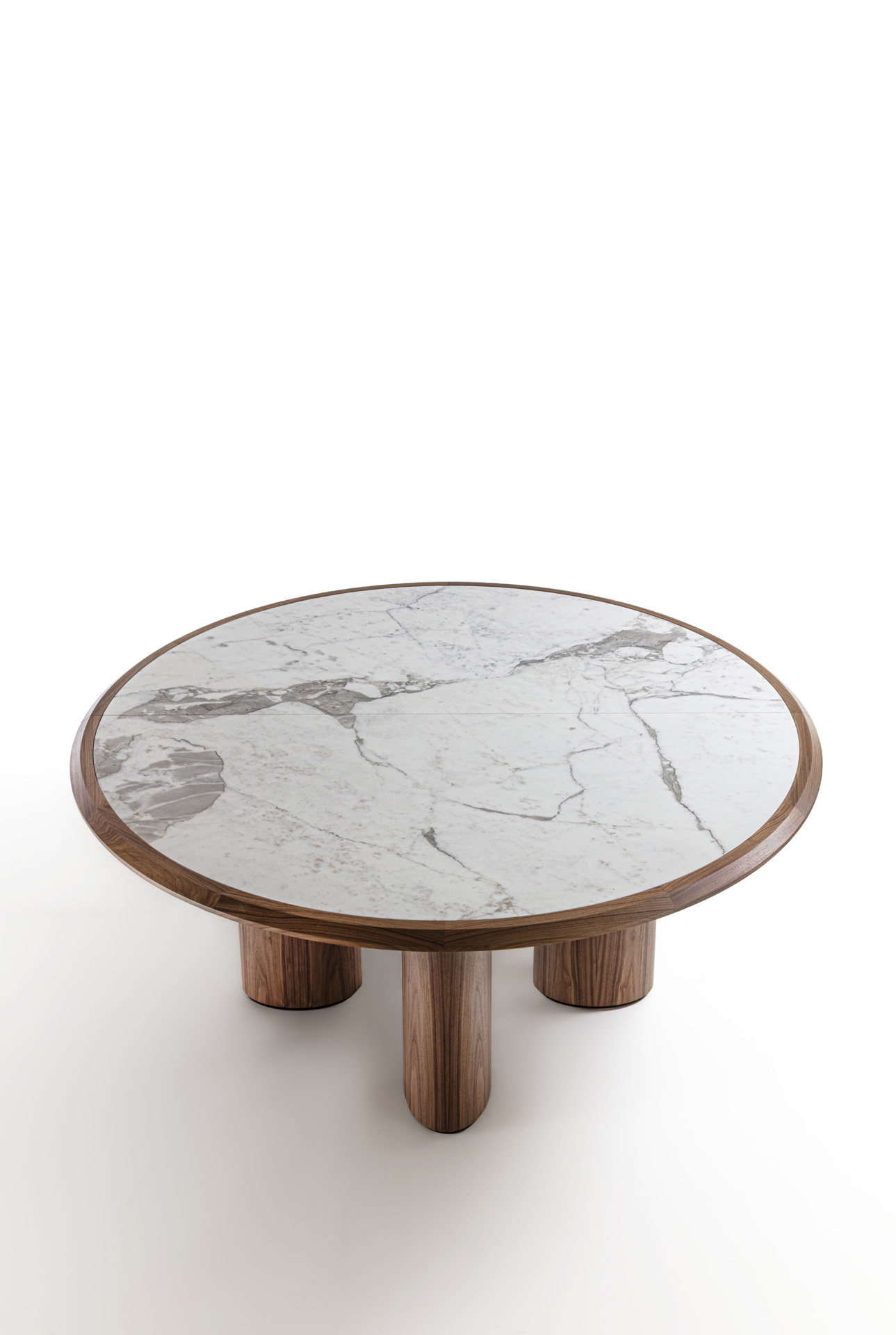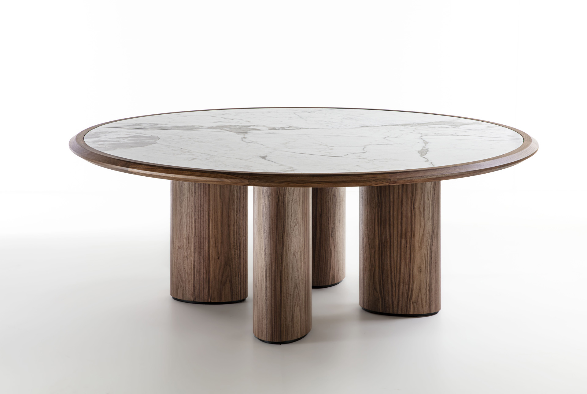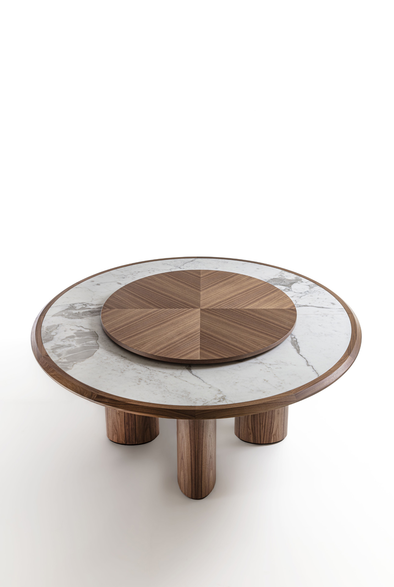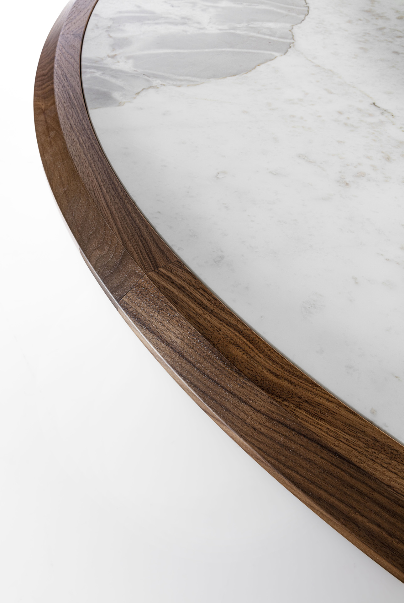 Round table with wooden structure and legs, with top characterized by a solid wood frame where the marble top is inserte.