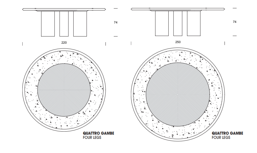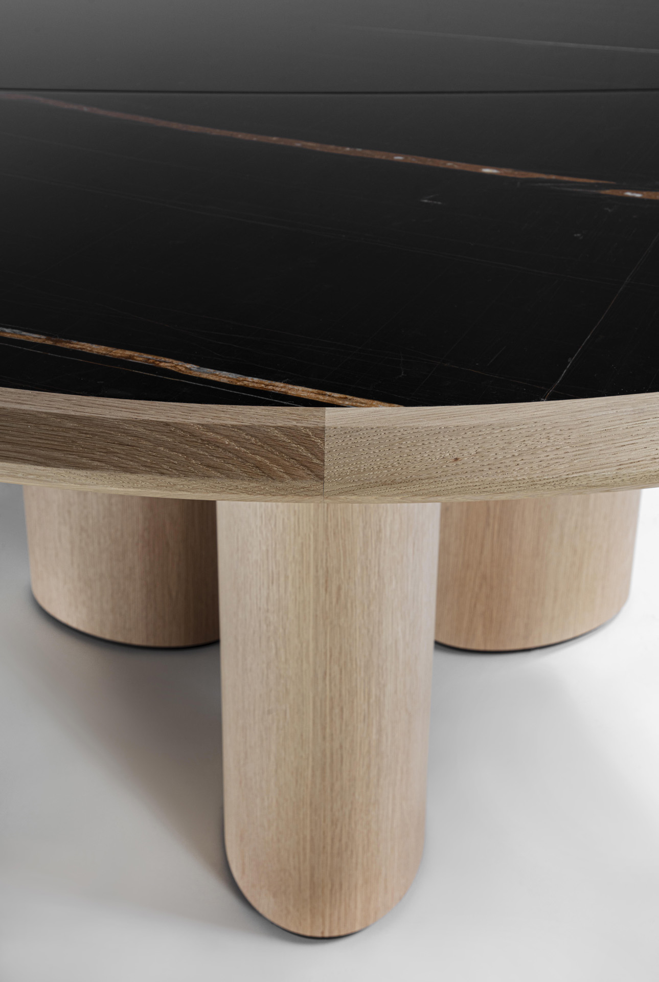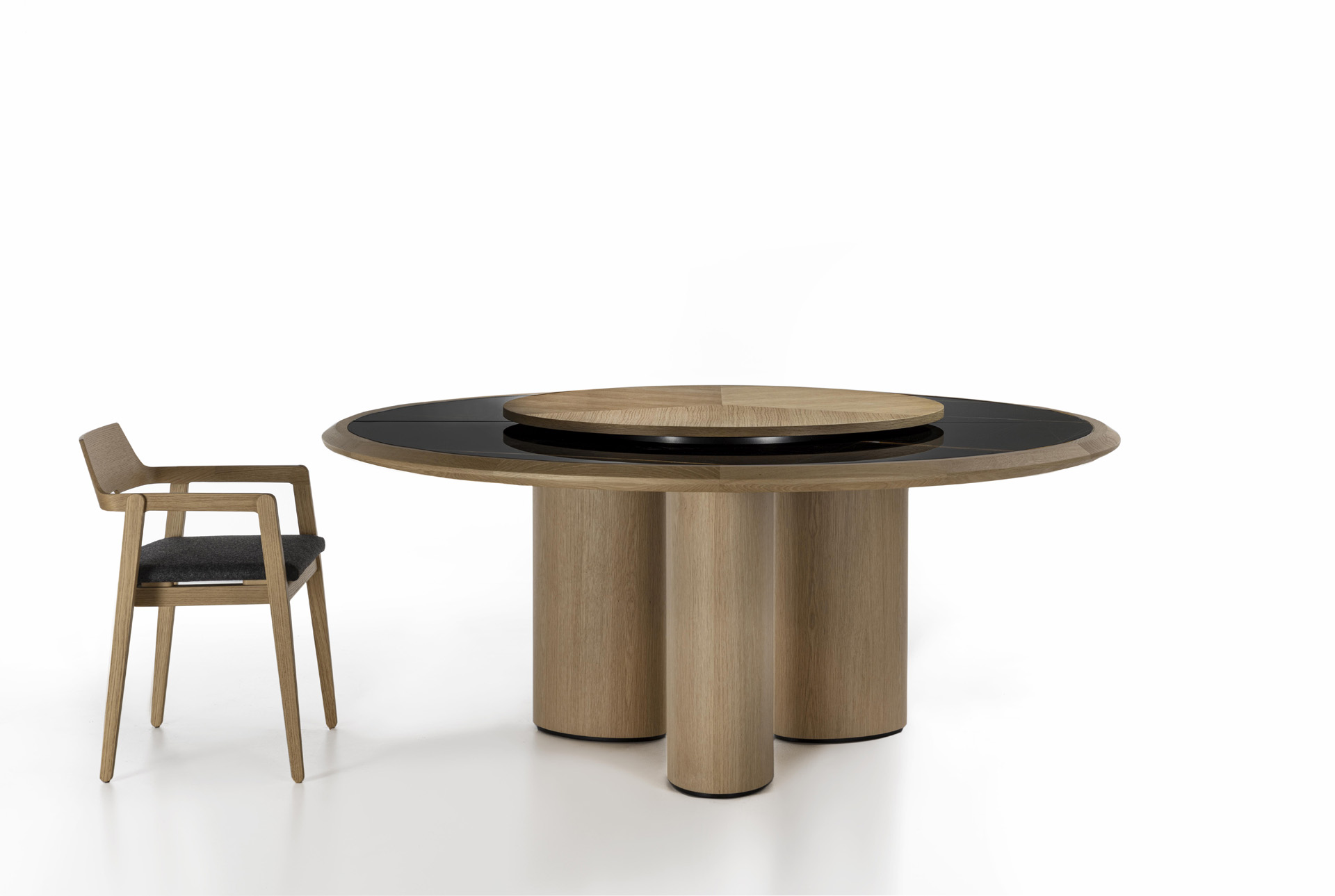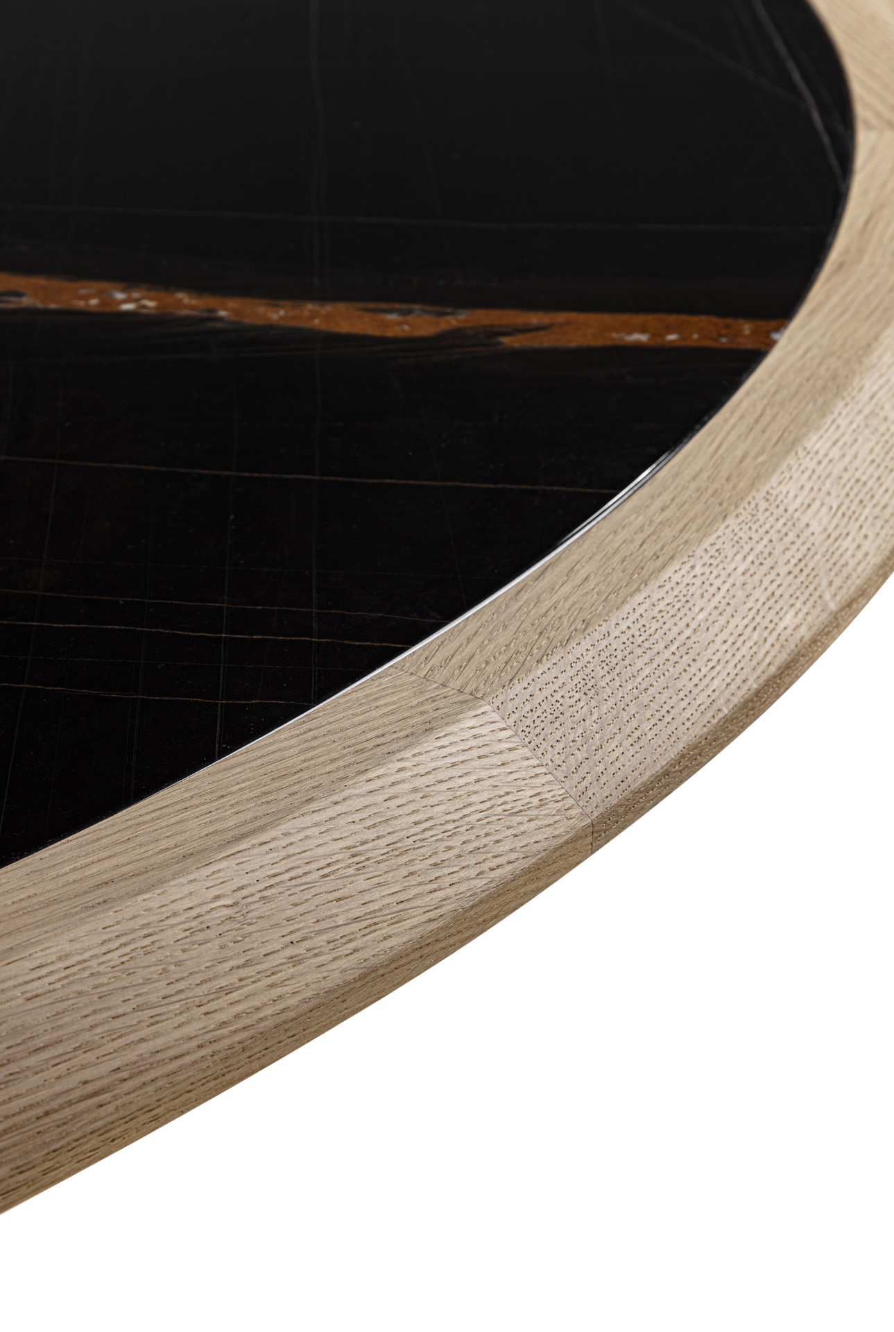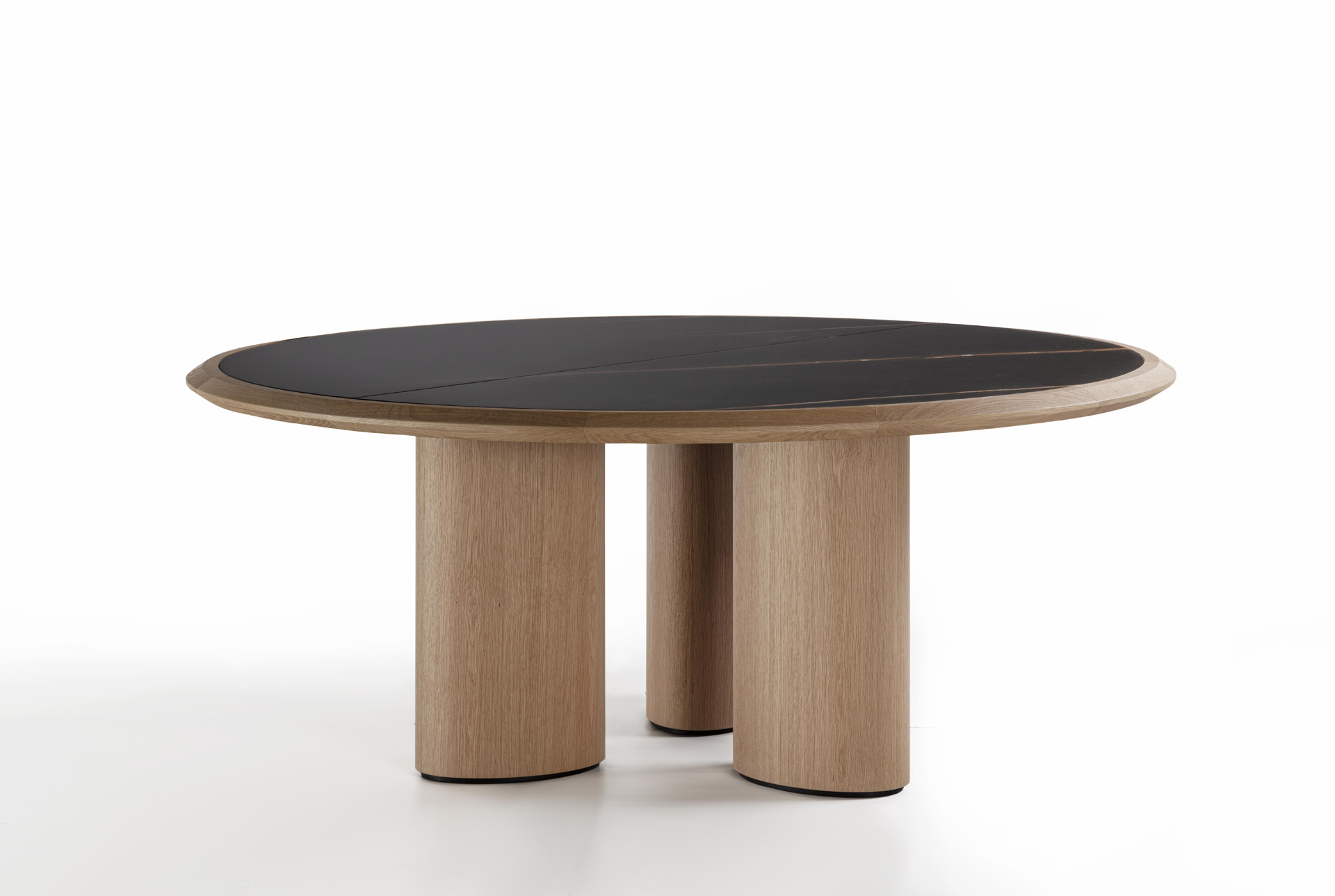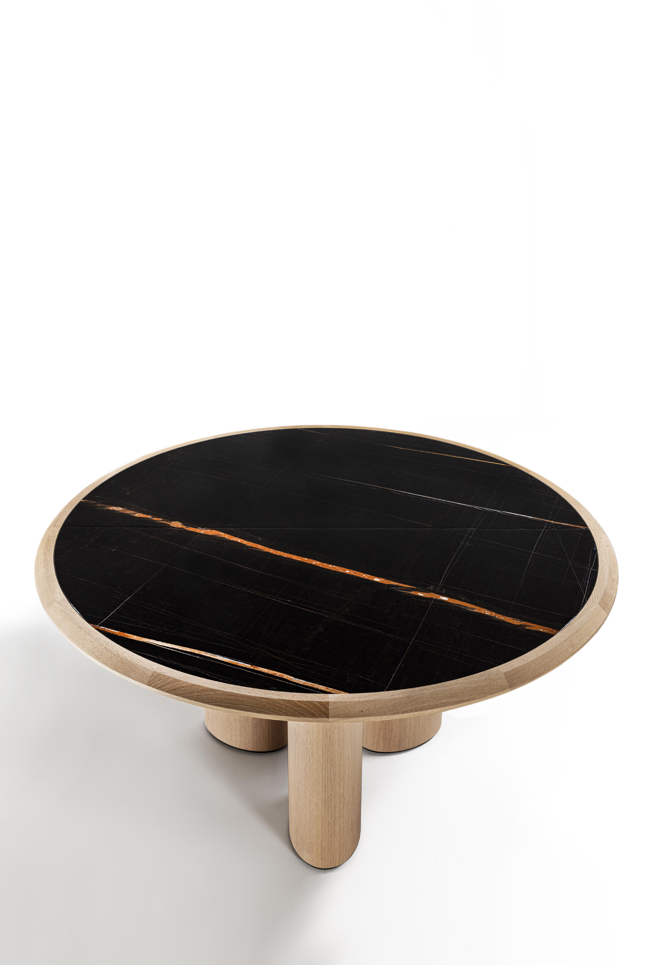 Round table with wooden structure and legs, with top characterized by a solid wood frame where the marble top is inserte.