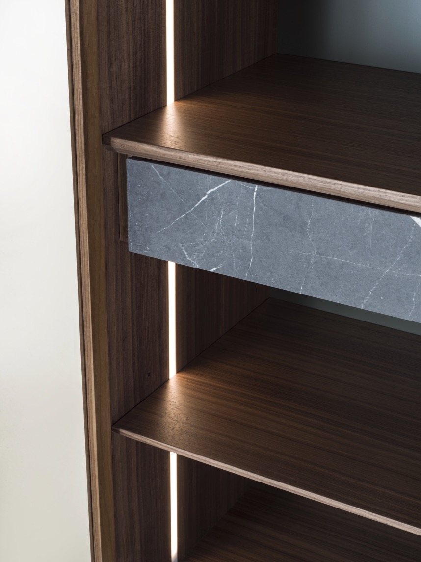 The top, the sides and the fronts are harmoniously together; the light, the design of the shelf profiles, the authenticity of the components together with the high quality technical-aesthetic devices tell the true artisan know-how of the territory and tell the story of a project with an elegant aesthetic sense perfect for any environment in its various proportions and finishes.