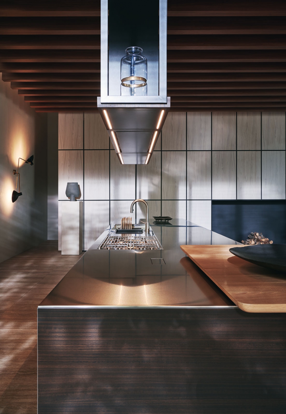 2018年推出新款設計理念獨特、簡單、具有線性結構的柜門。鋁制框架和錫金屬柜門,并且柜門設置精致柜面。柜門上方邊緣均有凹槽設計,便于開合。這款廚房與帶有分隔板設計的全新VVD抽油煙機柜罩以及Hi-Line6吧臺搭配而成,配有堅固的橡木和黑色橡木工作臺,圓角與斜邊設計,鋁質結構制成。島柜柜體采用珍貴材質桉樹制成,柜門為鋁合金框架,工作臺采用不銹鋼封邊,配有水槽和和爐灶。
