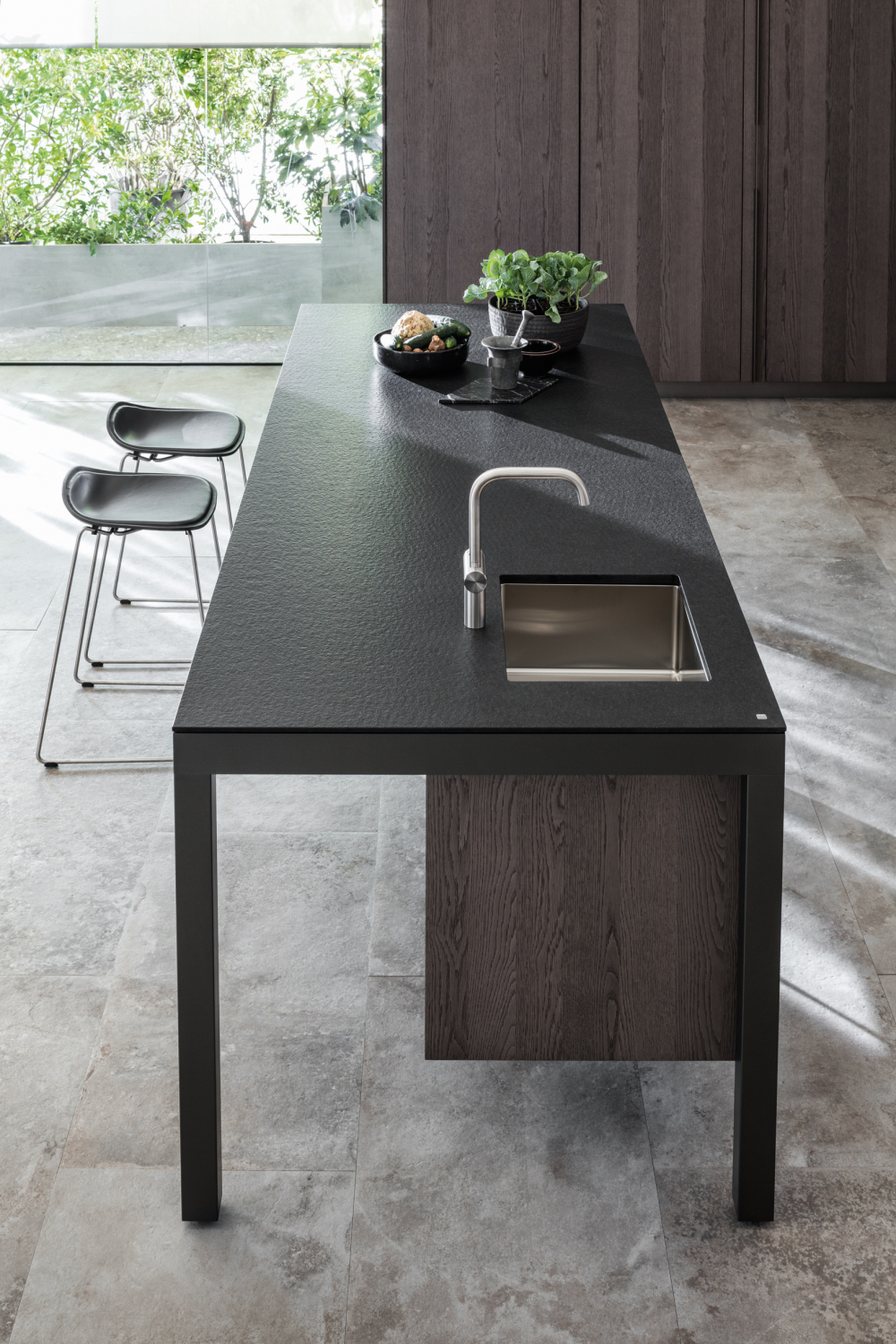 units below. The slim worktop rests on the aluminium frame, concealing its solid core.