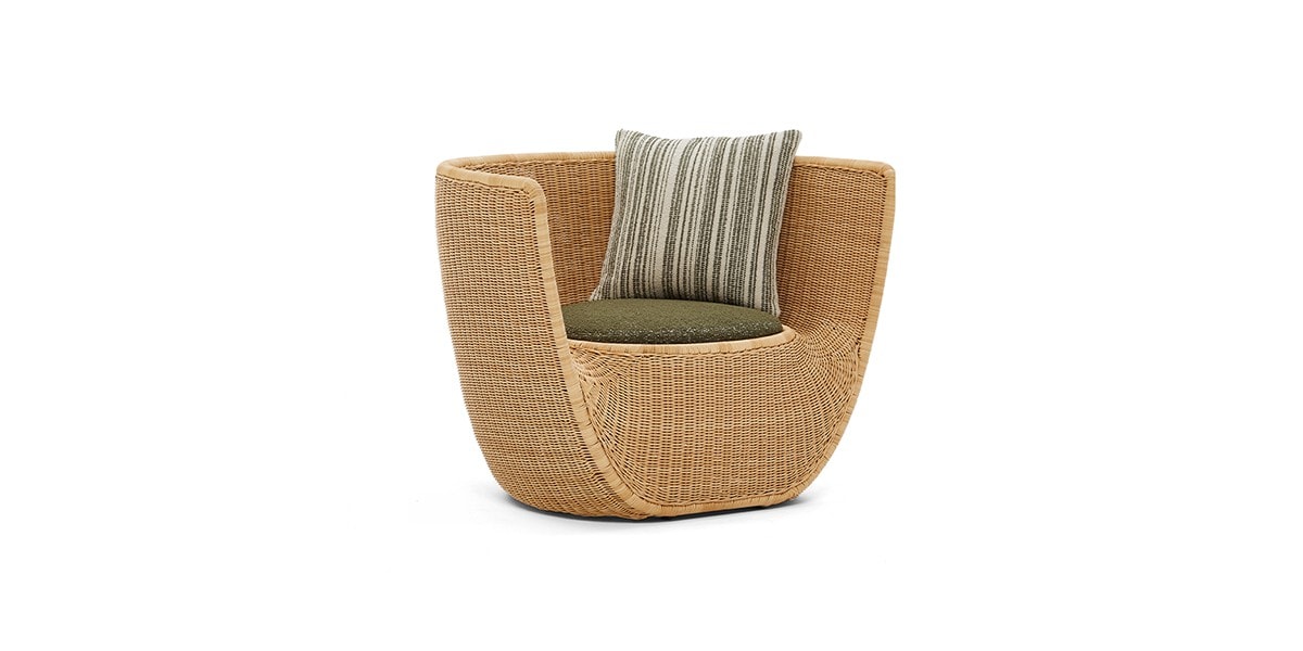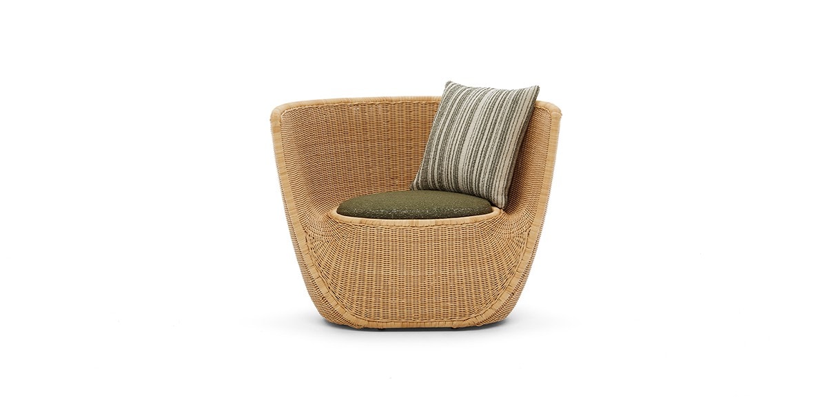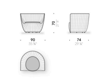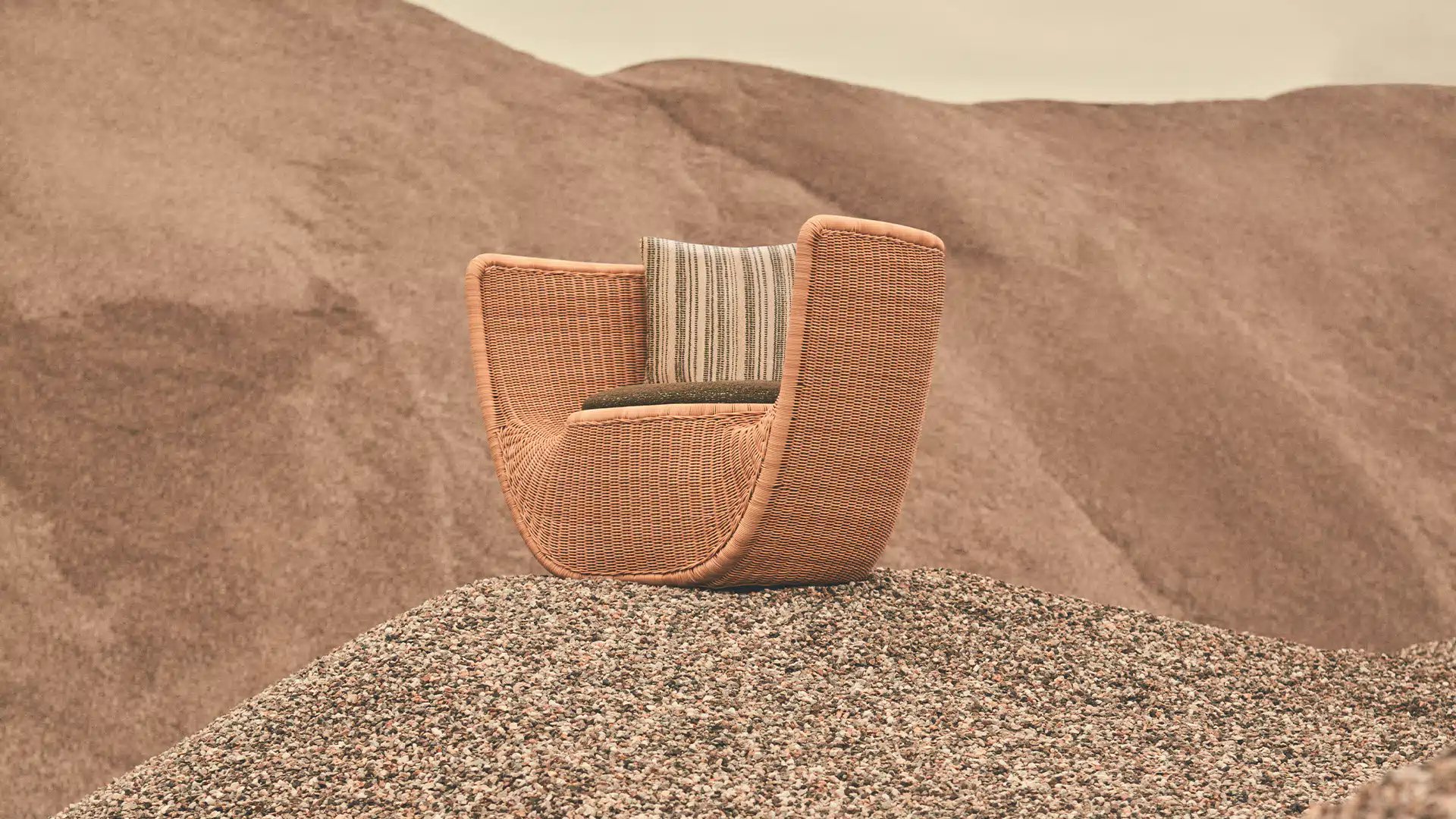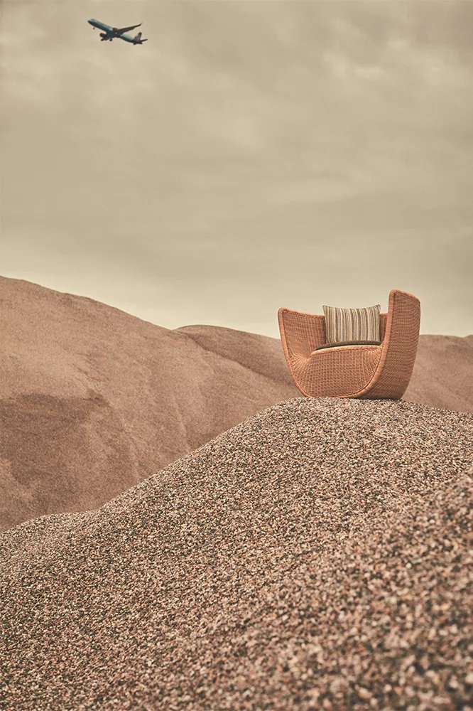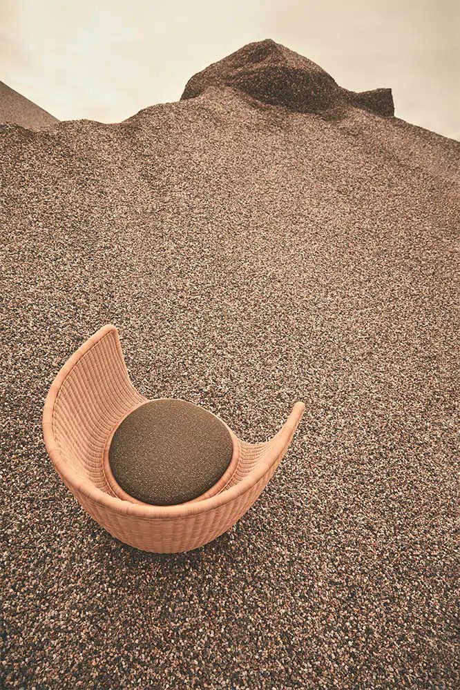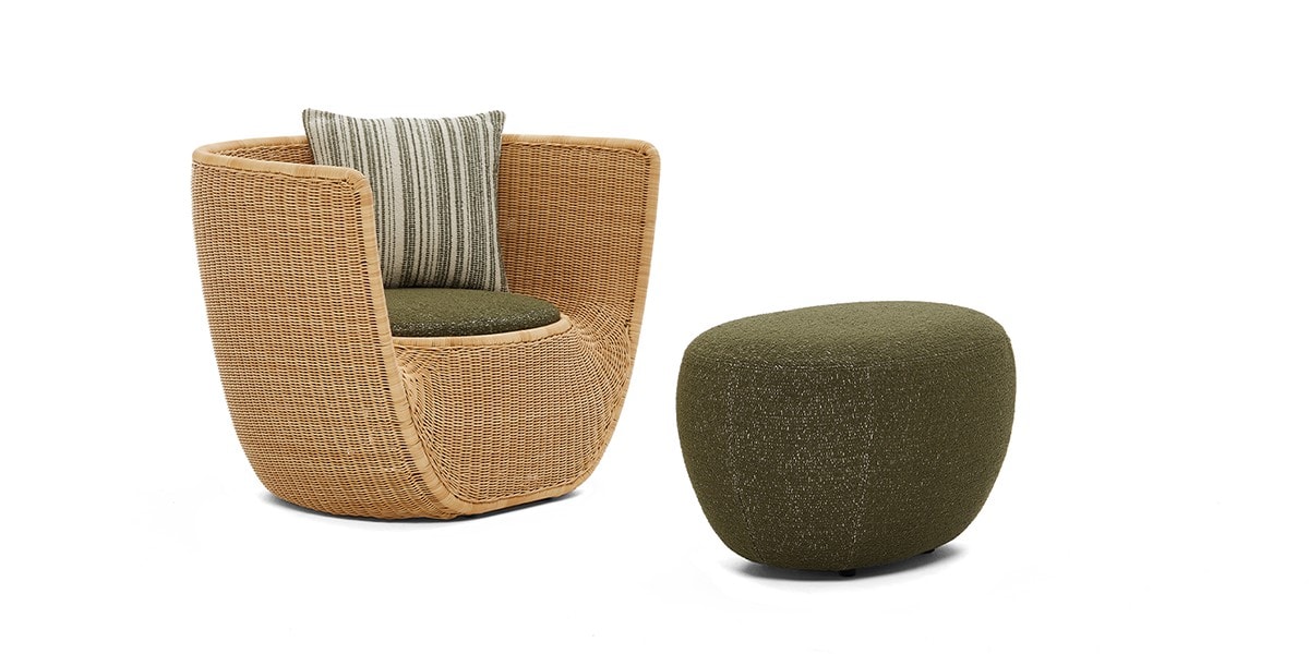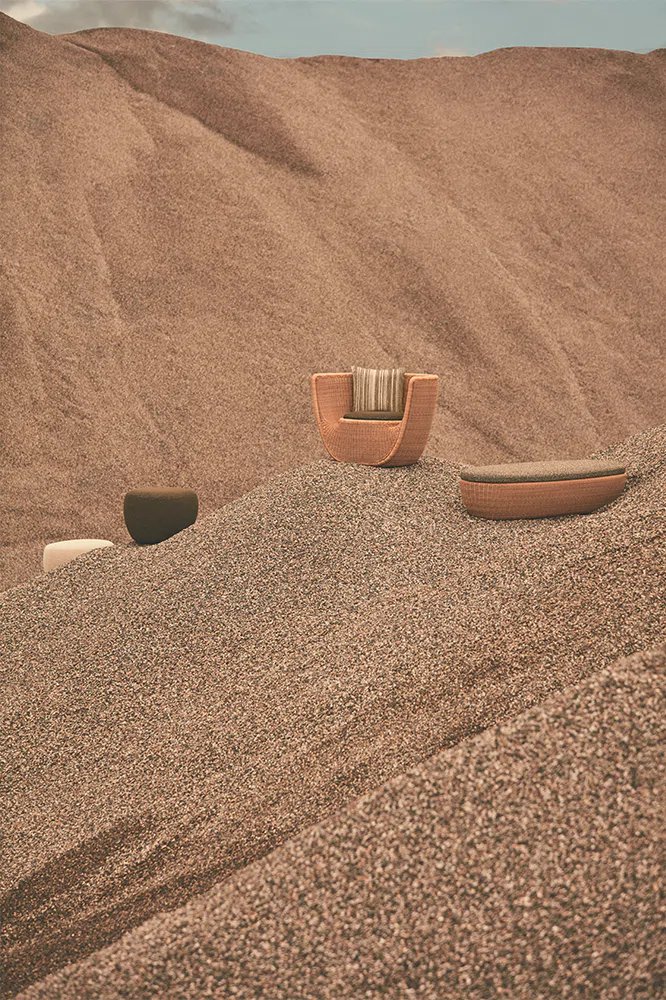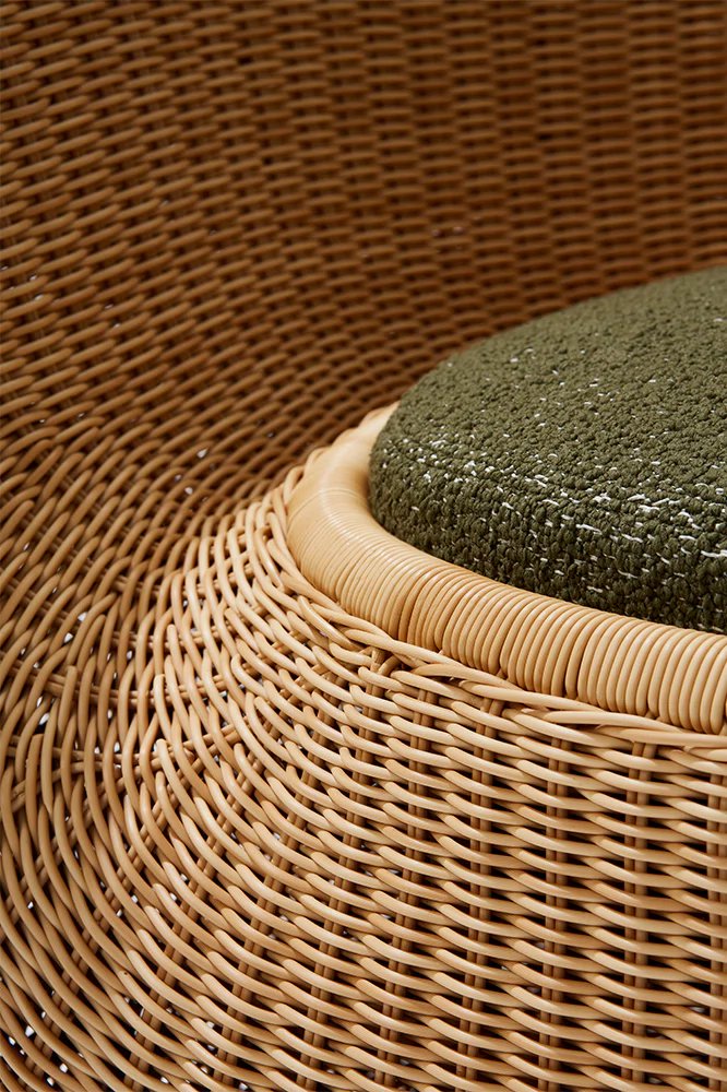 Reminiscent of sunny summer afternoons and the slow passing of time. Afternoons is an outdoor lounge set featuring an armchair, sofa, bench and oval coffee table with a choice of top in Pietra Lavica Smaltata, Pietra Bianco or Grigio Pece. Supported by an outdoor painted aluminium frame upholstered with natural-coloured, hand-woven PVC, the chair collection is padded with cushions in quick-drying polyurethane foam that fit perfectly into the silhouette. The collection is completed by a pouffe with Polimex and polyurethane frame and upholstered with a water-repellent cloth.