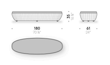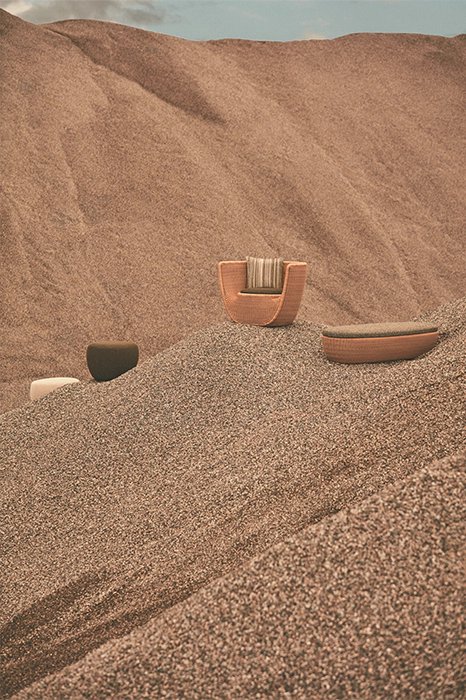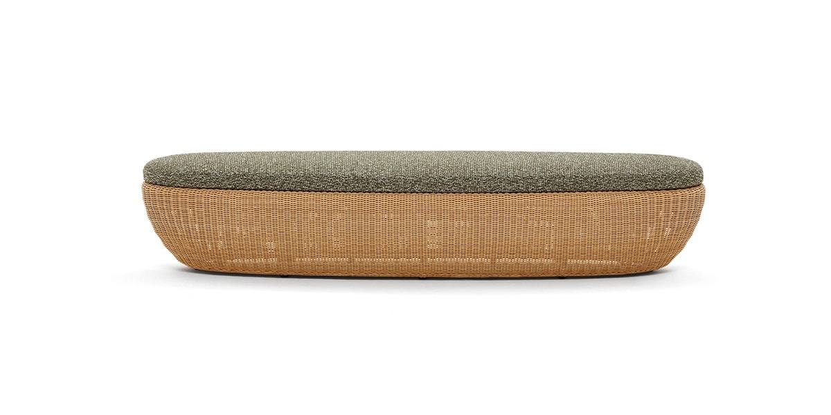 Reminiscent of sunny summer afternoons and the slow passing of time. Afternoons is an outdoor lounge set featuring an armchair, sofa, bench and oval coffee table with a choice of top in Pietra Lavica Smaltata, Pietra Bianco or Grigio Pece. Supported by an outdoor painted aluminium frame upholstered with natural-coloured, hand-woven PVC, the chair collection is padded with cushions in quick-drying polyurethane foam that fit perfectly into the silhouette. The collection is completed by a pouffe with Polimex and polyurethane frame and upholstered with a water-repellent cloth.