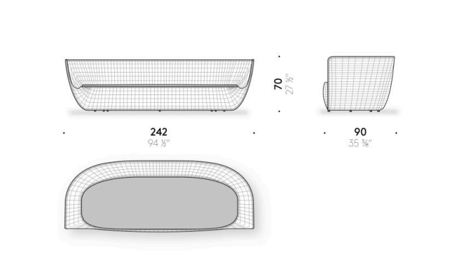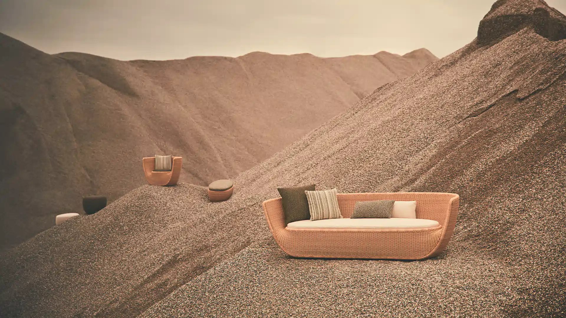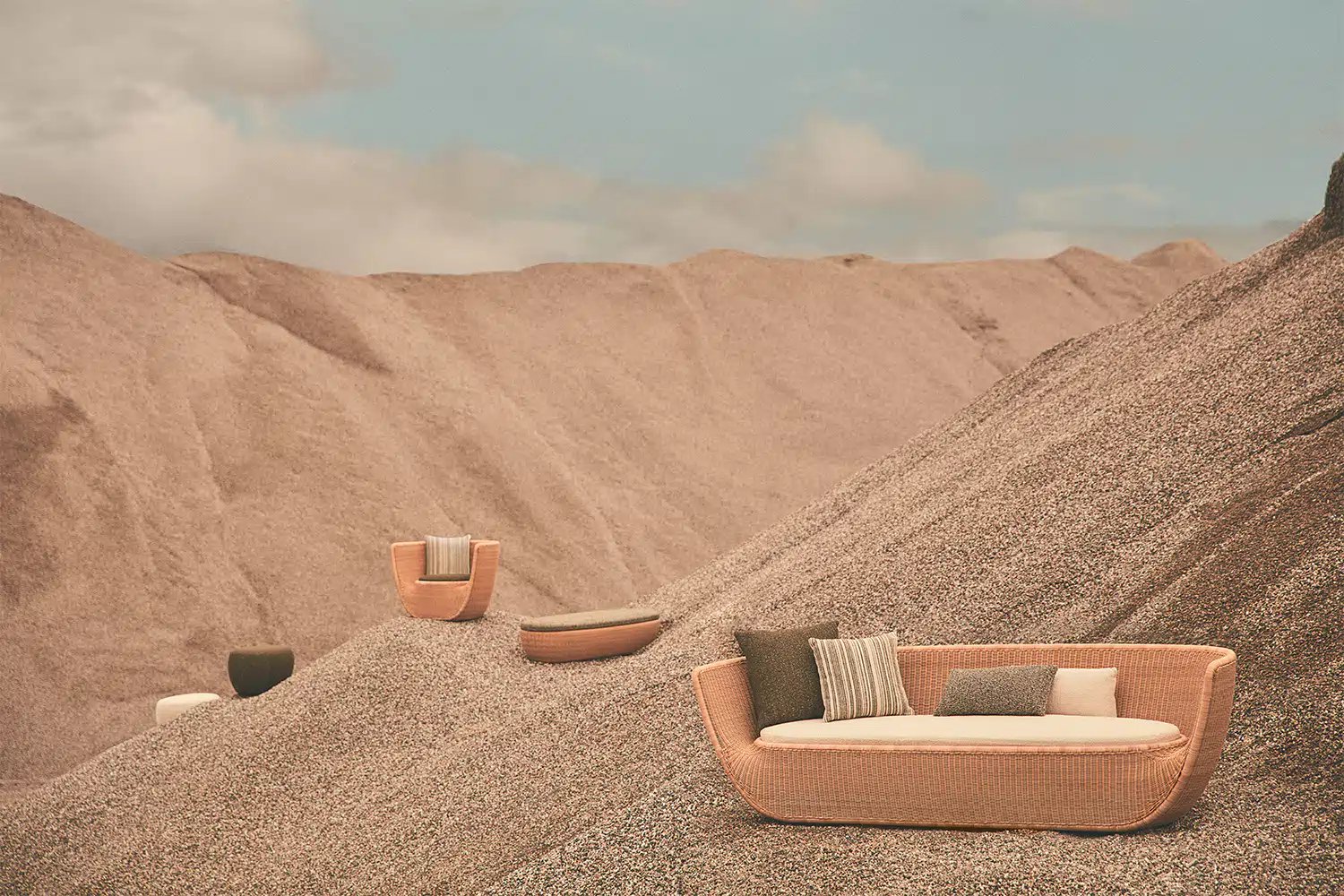 Reminiscent of sunny summer afternoons and the slow passing of time. Afternoons is an outdoor lounge set featuring an armchair, sofa, bench and oval coffee table with a choice of top in Pietra Lavica Smaltata, Pietra Bianco or Grigio Pece. Supported by an outdoor painted aluminium frame upholstered with natural-coloured, hand-woven PVC, the chair collection is padded with cushions in quick-drying polyurethane foam that fit perfectly into the silhouette. The collection is completed by a pouffe with Polimex and polyurethane frame and upholstered with a water-repellent cloth.